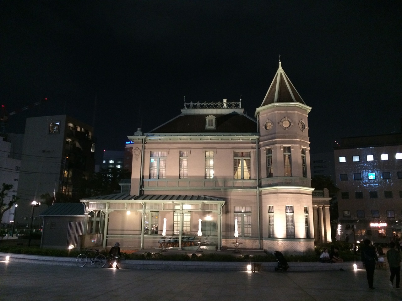 自分が生まれた年に国の重要文化財に指定された建物で、建てられたのは明治43年、1910年という戦前の建物です。夜だったので、すでに入る事はできませんでしたが、室内からもライトアップされていて、淡く美しかったです。