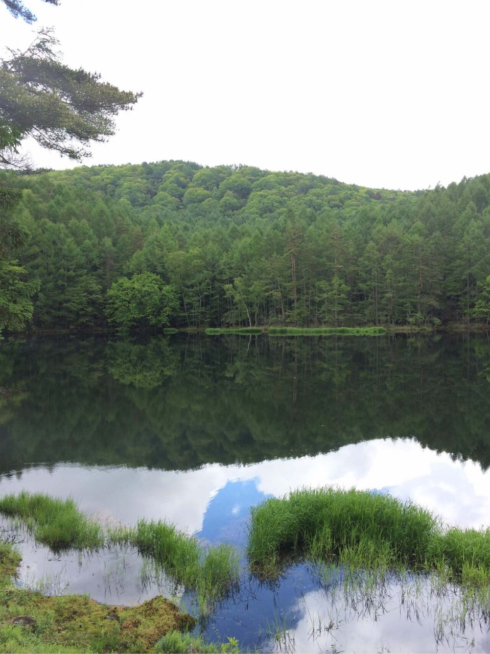 CMで話題になった御射鹿池に自家用車で朝早くに行ってきました。池の湖面には、緑の木が映って、ノルウェーのおとぎ話の世界のようでした。三脚を立てて写真を撮りましたが、空が池にうつるのを実際の色と同じに撮るのは難しかったです。