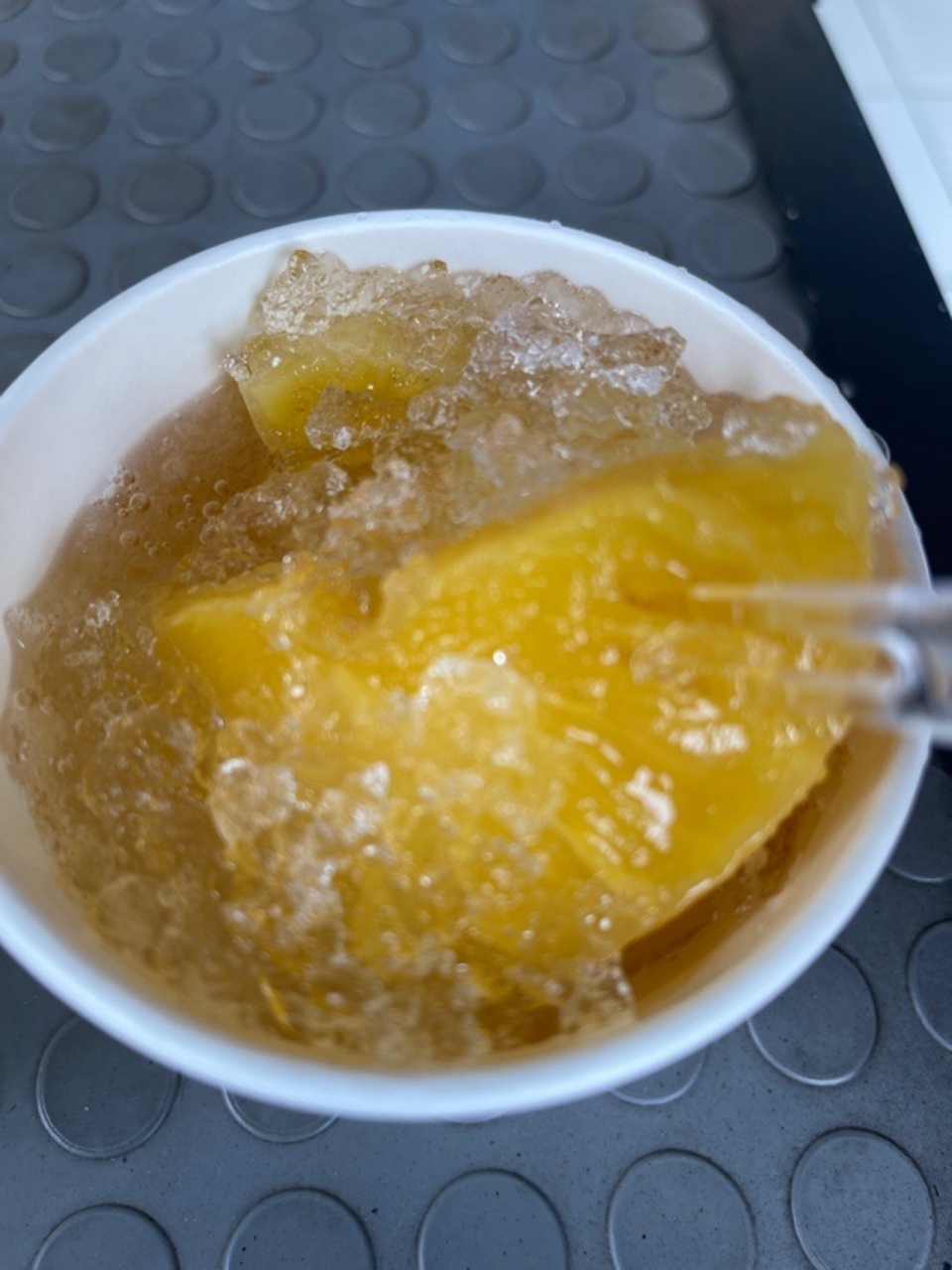 暑い日に食べると、ものすごくおいしかったです。氷と自然のパイナップルの甘みがなんとも言えず、人工的なコンビニのアイスとは違う、体にしみわたるおいしさでした。紙容器と、プラスチックの簡易フォークは店頭でリサイクル回収されています。