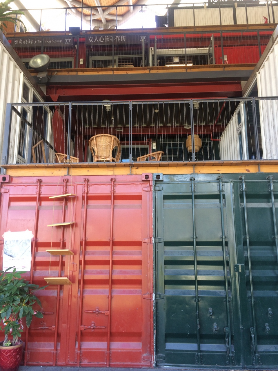 コンテナっぽい建物で、異なるテナントがたくさん入っていました。上の階のほうは、太陽が当たるので暑かったです。台東の原住民の衣装や小物を扱っているお店がありました。1階のカフェでは台東のコーヒー豆を使ったコーヒーがありました。
