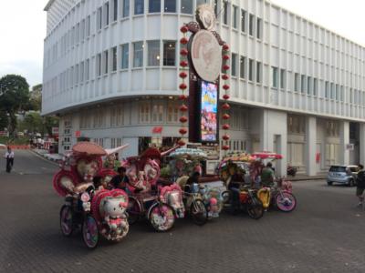 オランダ広場に到着すると、ものすごいド派手な大きな三輪車みたいな人力車みたいな交通工具が停まっています。ハローキティ、ドラえもん、スパイダーマン、ピカチュウなどのキャラクターで派手に飾られていて、音楽もにぎやかでした。乗る勇気はなかった…