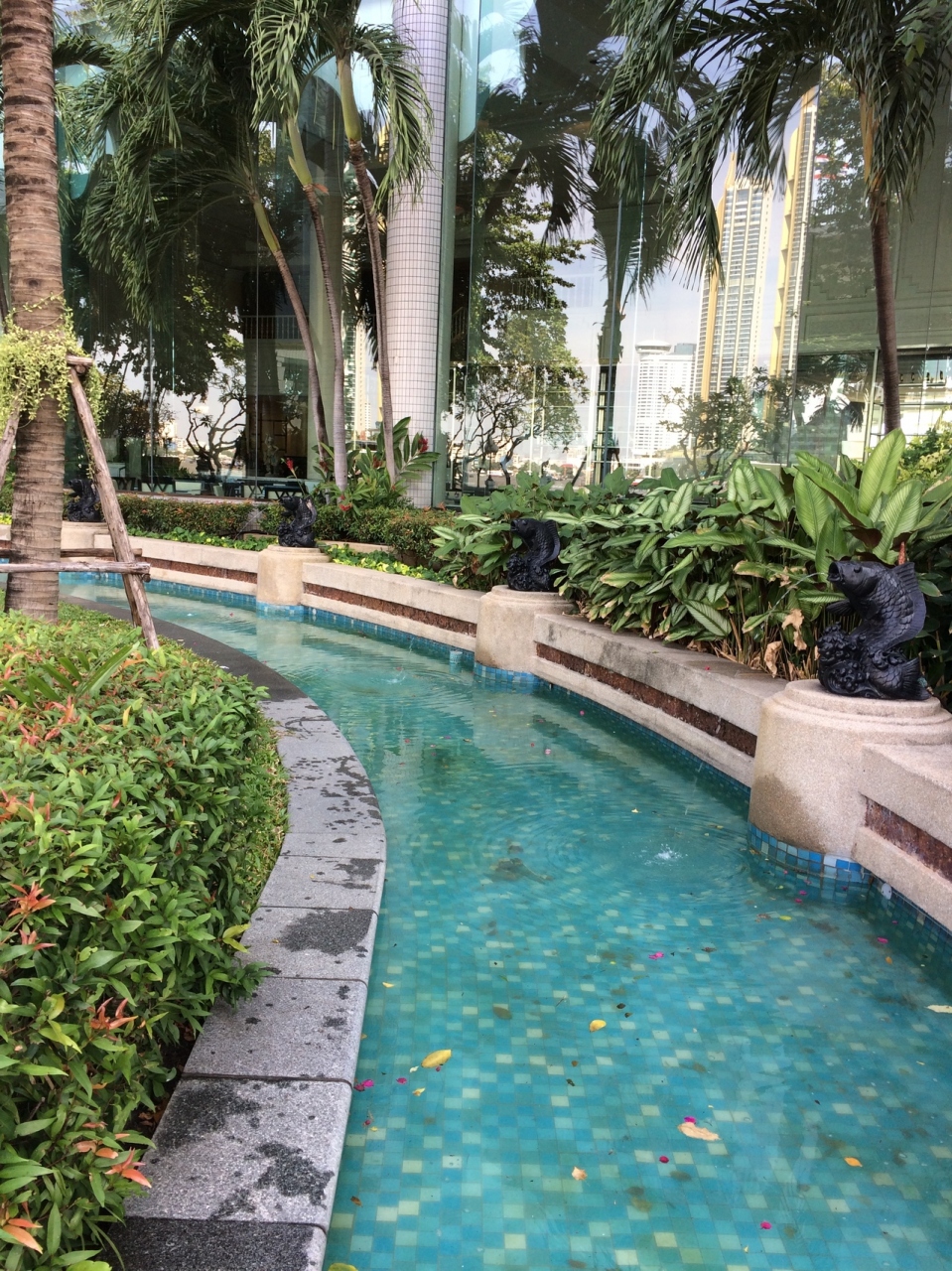 ホテルに入るにはセキュリティチェックを受ける必要がありました。ロビーには、蘭やブーゲンビリアの花が飾られ、水も流れている大変良い空間でした。クーラーが効いていて、気持ちよかったです。プールからはチャオプラヤ川が見え、みながら泳げます