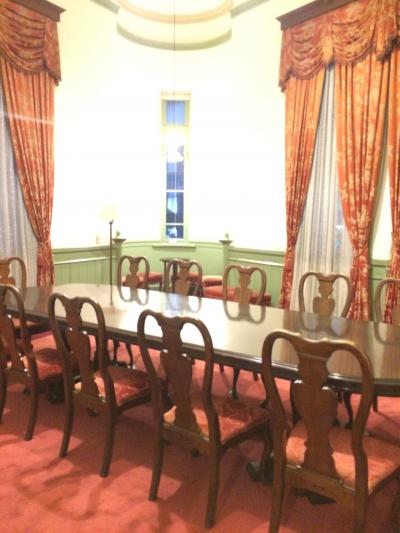 個人的には、監察院として使用するにはあまりにも勿体ない気になってしまいます。それぐらい、壁も天井も素敵な造りです。アーチのある窓で珍しい、上下で開くガラスの窓は、窓枠とともに日本の建築の知恵が反映されています。