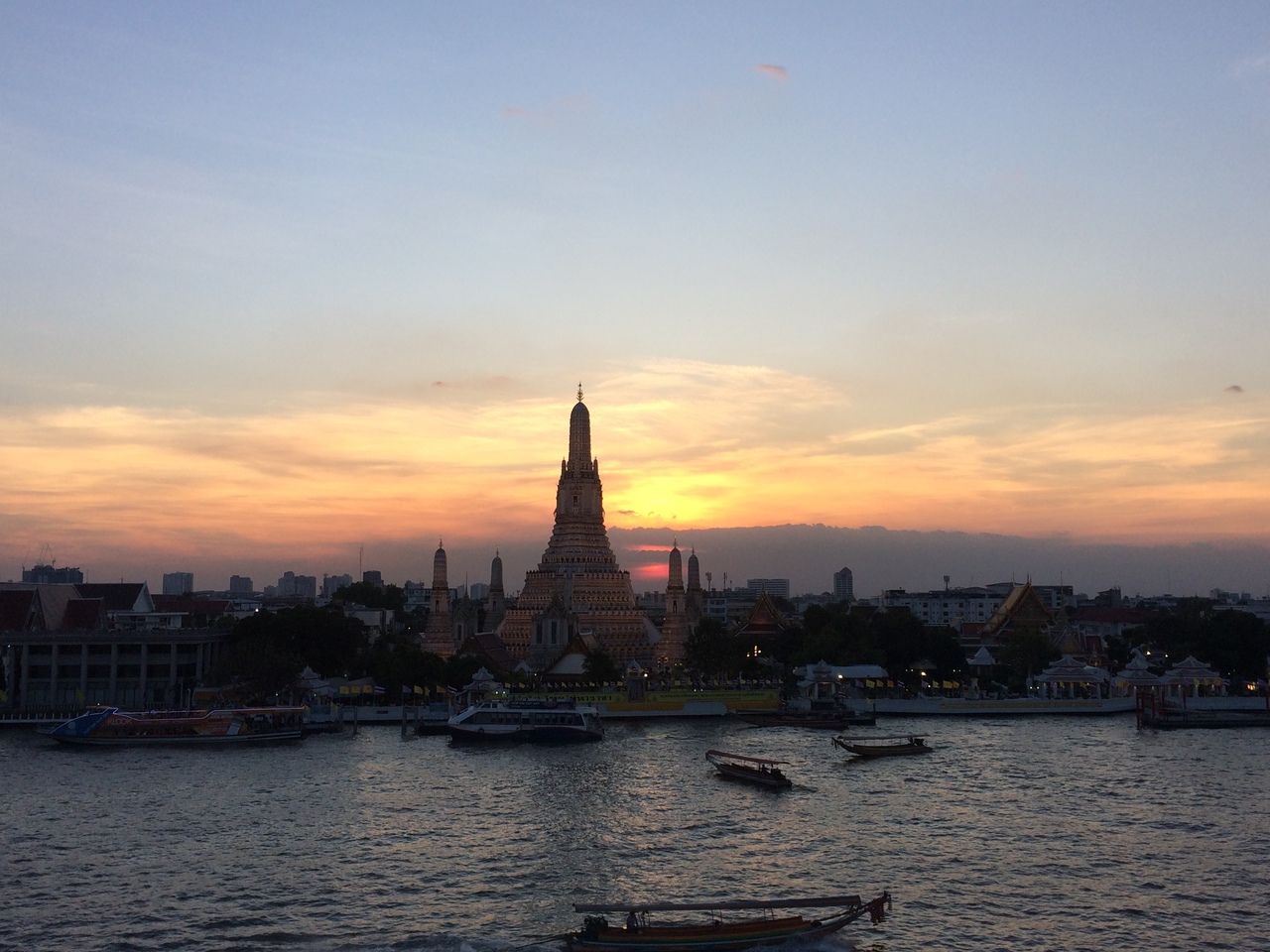 すごく暑かったタイで一気に暑さと不快感がふっとんだ、ワットアルンの景色です。ネットで調べて、対岸から見る方が美しいとのことだったので、夕暮れ時からチャオプラヤー川のほうで、待った甲斐がありました。色のグラデーションが良かったです。