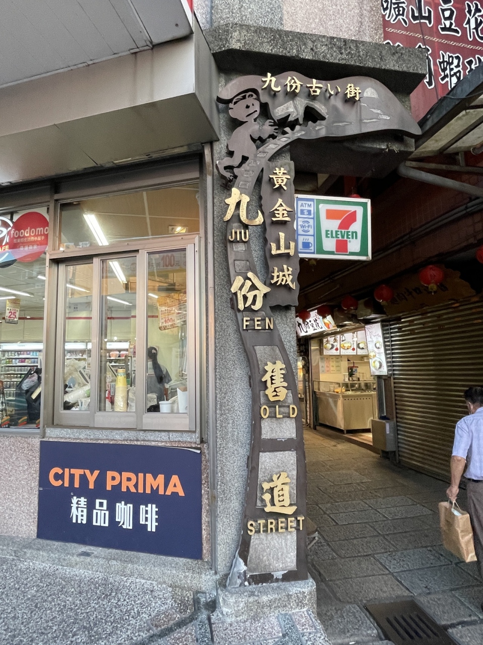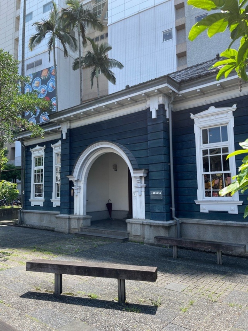 宜蘭駅から歩いて幾米公園まで行き、そこから藍屋餐廳に到着しました。ジミー・リャオの作品が1つ、レストランの前のバス停にありました。建物の前にも、2個木製のベンチがあり、それも含めておしゃれなスポットでした。