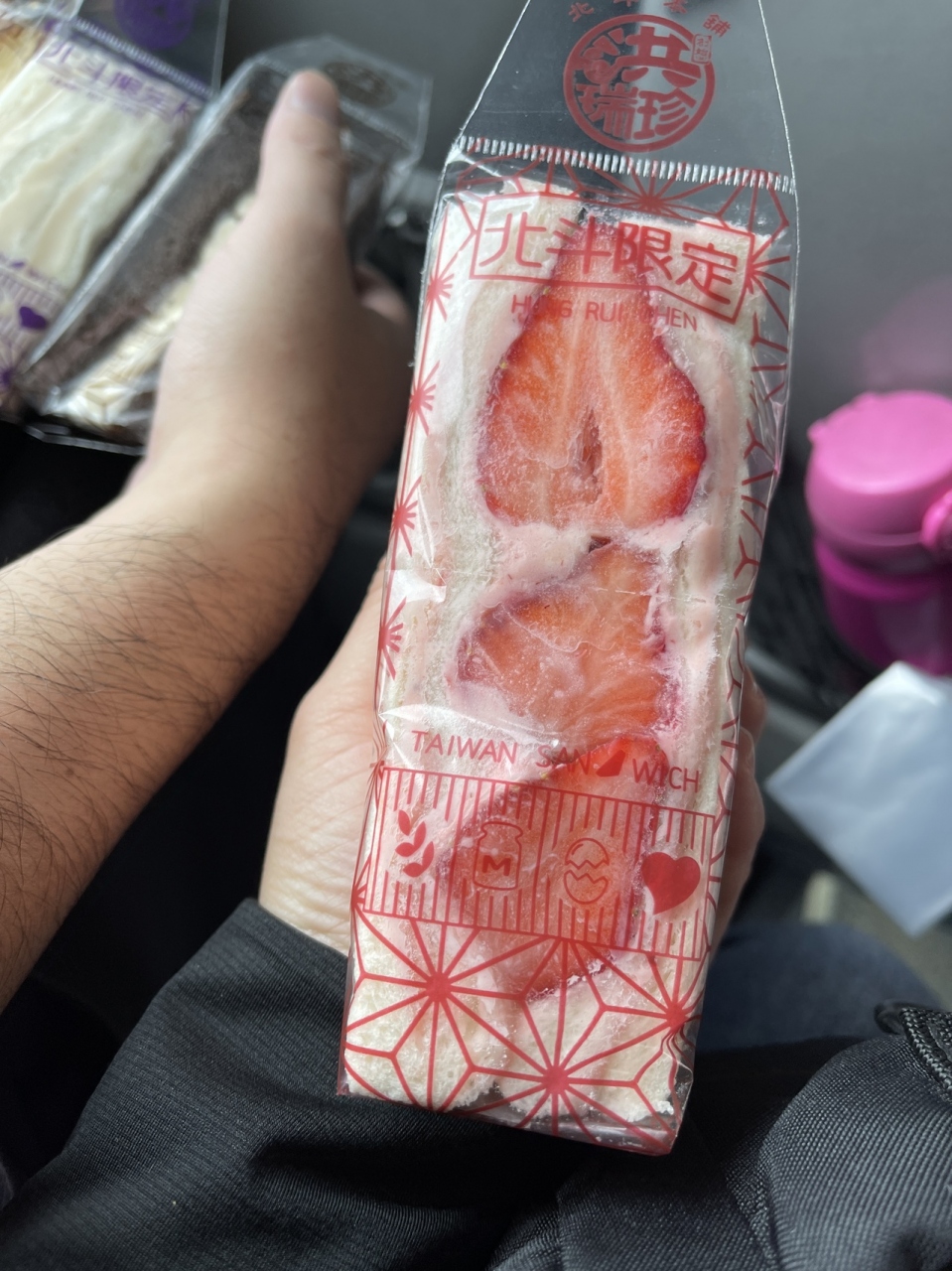 ここ最近、台湾で非常に流行っています。日本でも、フルーツサンドイッチがカラフルでインスタ映えしていましたが、ここのお店のもいちごやオレンジなどカラフルです。クリームは、日本の生クリームほどのおいしさはありません。