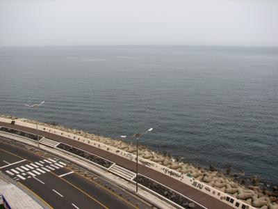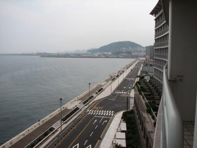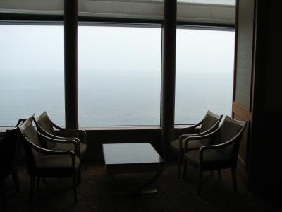 会議室の横の休憩室からは海がよく見える。残念ながら今日は曇り空だけれど...