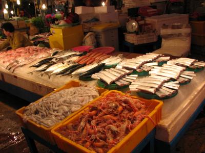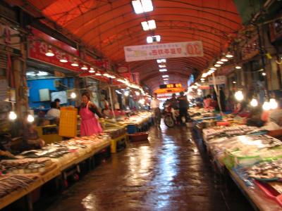 入ってすぐのところは、魚やさん街!ず〜〜と魚ばかり。チェジュ島は、魚介...