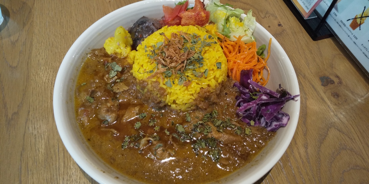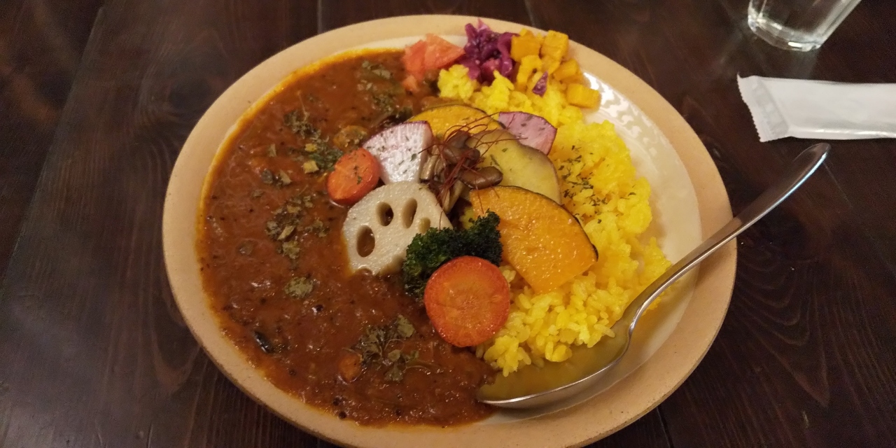 京都・円町駅近くはスパイスカレーの激戦区。駅から徒歩圏内の場所にあります。店内は薄暗く落ち着いた雰囲気で、カウンター席と座敷がありました。メニューは多くないですが、辛さを選ぶことができ、野菜たっぷりのカレーが食べられます。