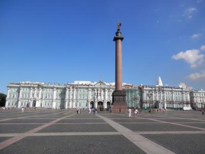 エルミタージュ美術館とアレクサンドルの円柱、宮殿広場です。朝のうちは人...