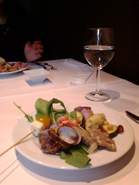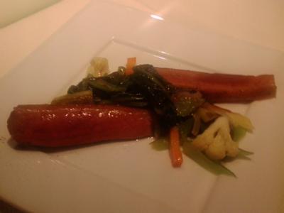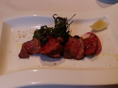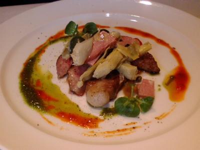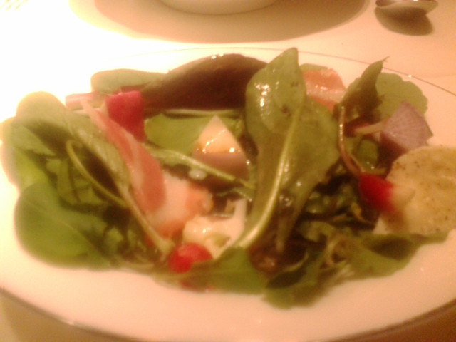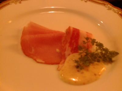 運よく(?)個室での食事。前菜のベーコンとハム。このハムが美味しかったのだが、購入不可。(泣)その後のさっぱりしたサラダも美味!!