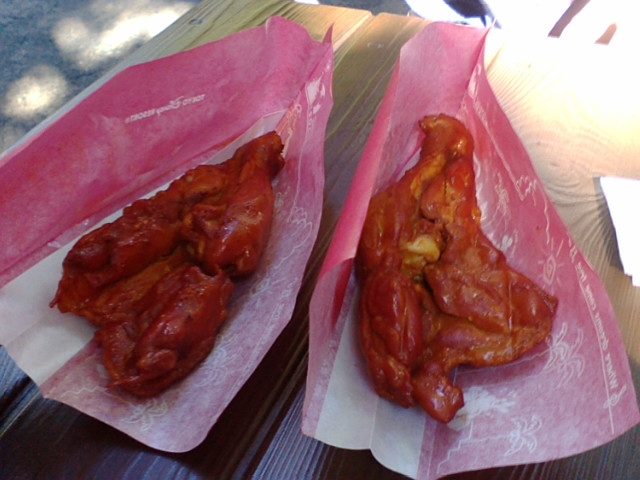 いつも、みんながパクパク食べている<チキン>を見ていたが、今回初めて食べてみました。スパイシー感が強くないので、子供でもOKだと思います。その為か、スモーク感も感じられるチキンです。が、パーク内に入ったら、早めに購入した方がいいと思います。食事時間やおさんじの時間帯は結構な行列でした。って、いっても、その他の時間帯でも並んでいましが。(笑)今回主人と11時過ぎに行っても10人位は並んでましたから!でも、美味しいので、並んで食べてもOKだと思います。