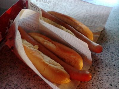 1個¥380で、大きなウインナーに出会えます! って、ホットドッグの事なんですけどね。しかし、野菜はサンドされていません。パンからはみ出るウインナーのみのドッグです。小腹が空いた時などには気軽に持ち歩け、いいと思います。黄色い車で販売していますが、11時からの提供なので、早くに行っても買えません。今回、朝食抜きで家を出発し、パークに入場と共に食べようと考えていて、失敗しました!