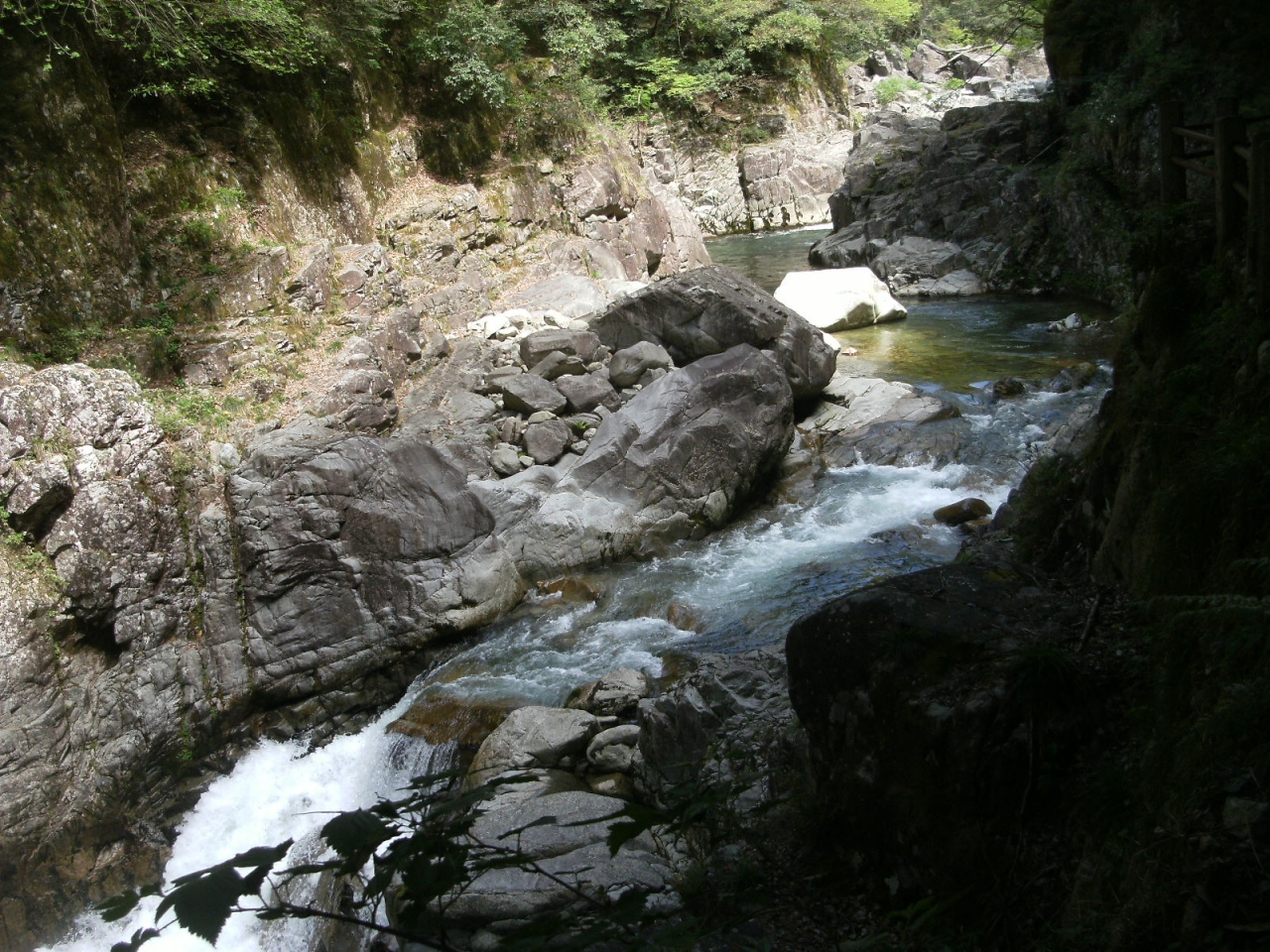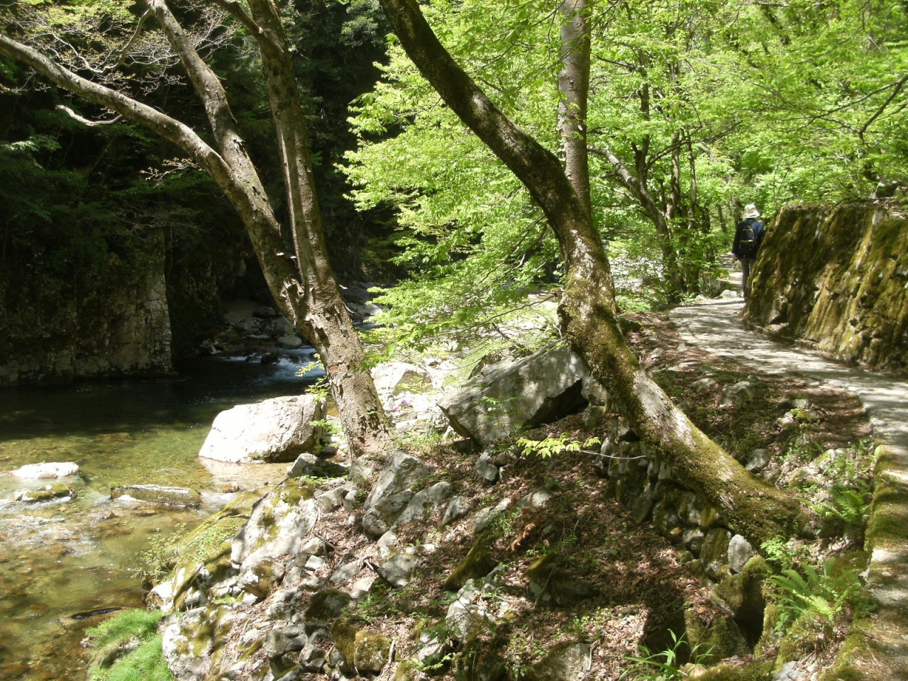 今回歩いたのは正面入口から水梨駐車場までで、その先の猿飛峡や三段滝には行けませんでしたが、大岩壁や激流、深緑色の神秘的な淵、穏やかな流れの開放的な川原、鮮やかな新緑の森、ラショウモンカズラやイチリンソウといった春の草花など、いろいろ堪能できました。三段峡バス停と水梨駐車場の間には土日祝限定で1日1往復マイクロバスの定期便があり、帰路はこれを利用しました。