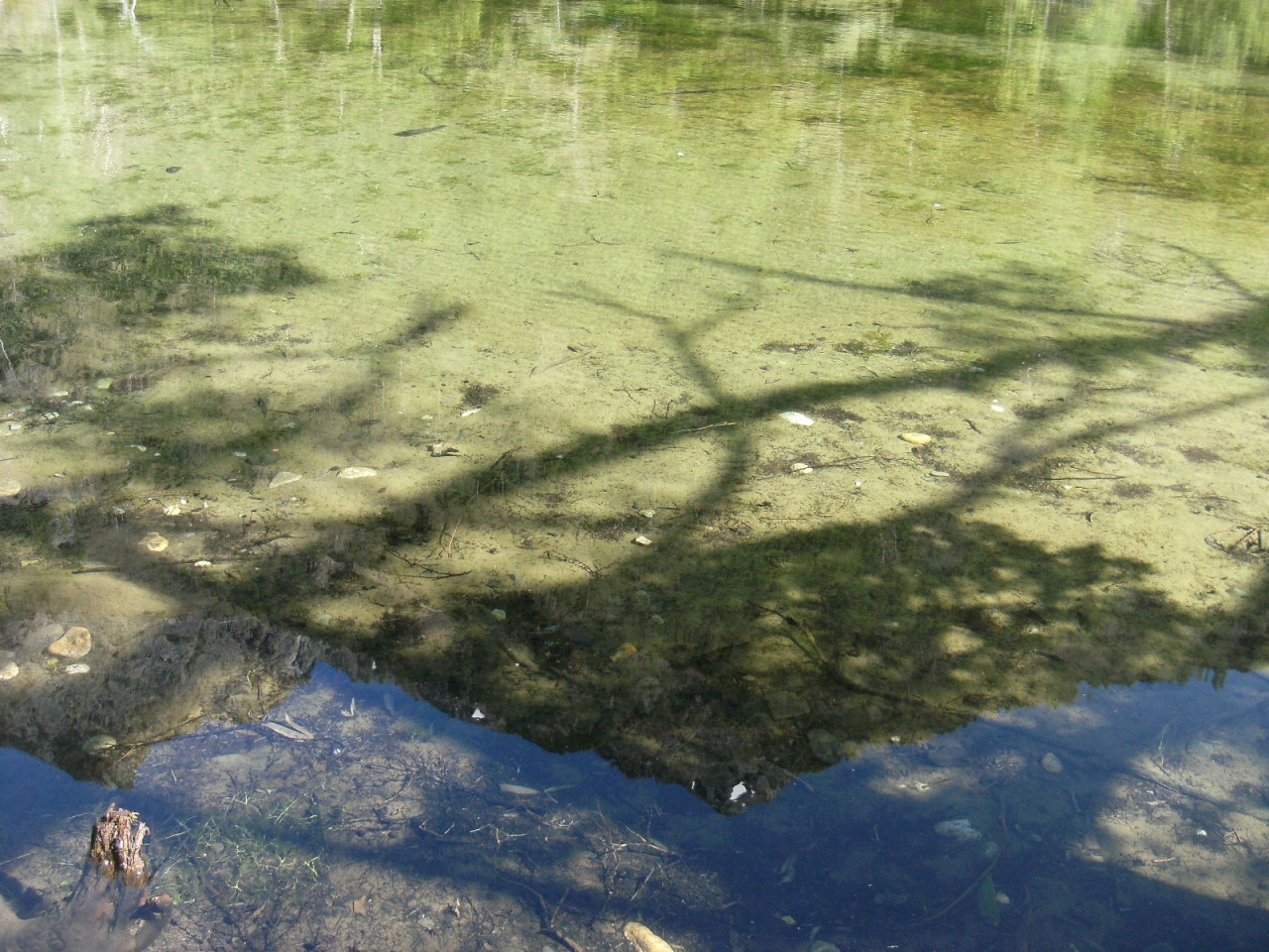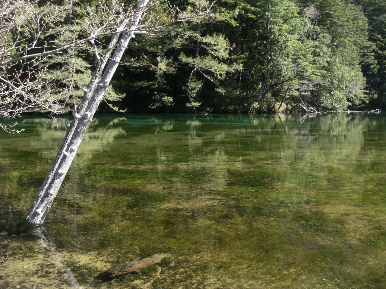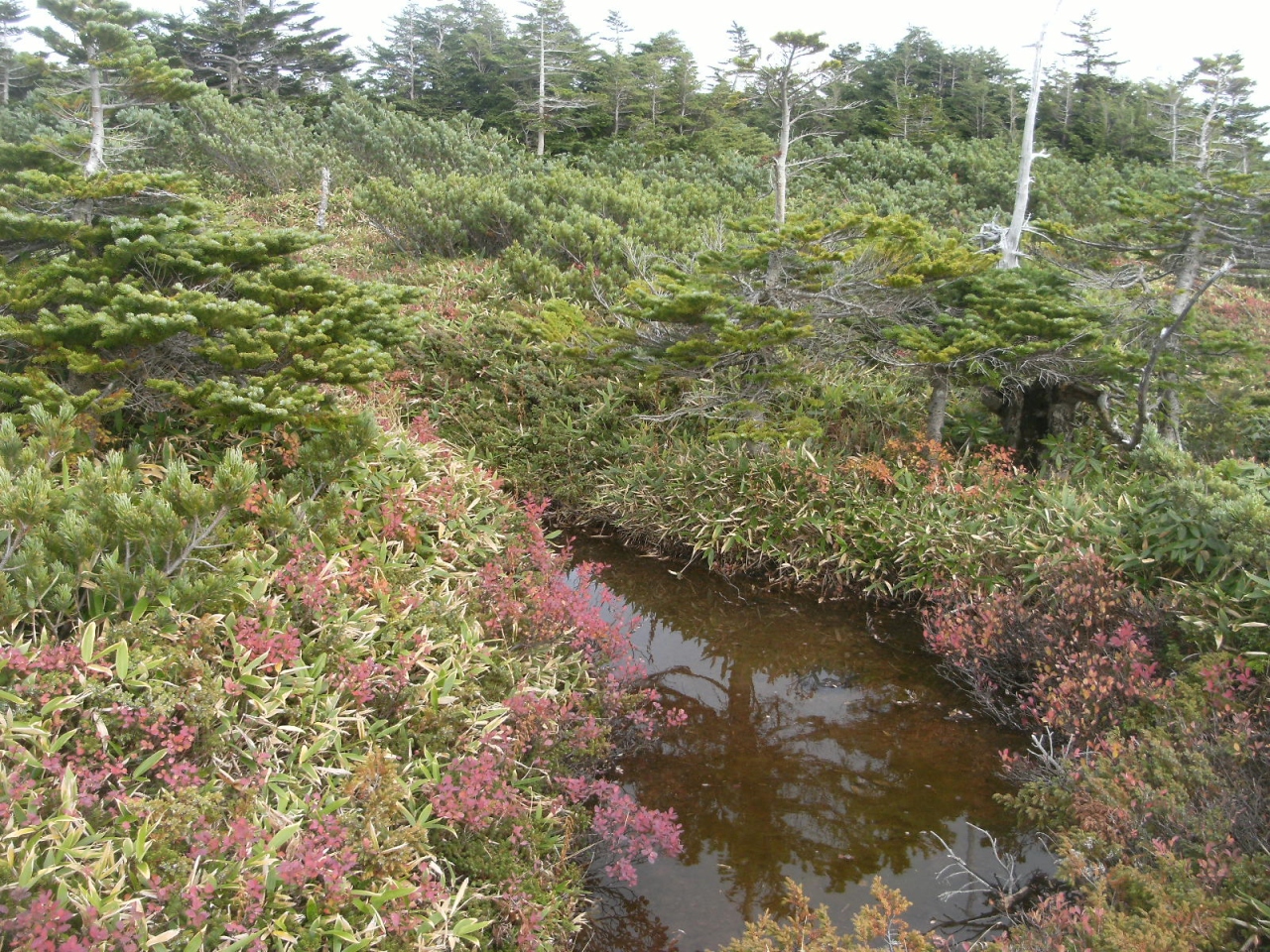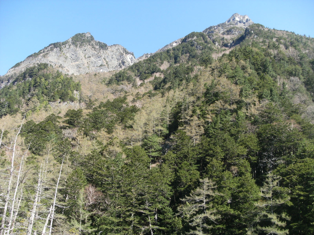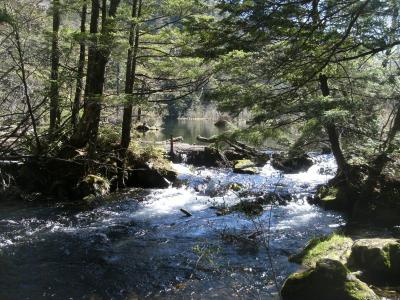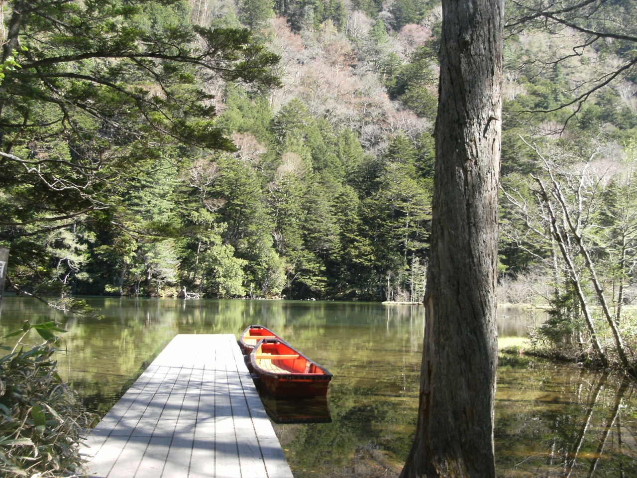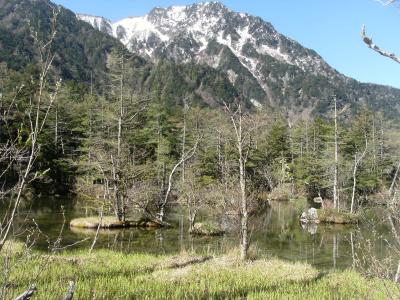 水面が水鏡となって明神岳を映している一の池、天然の浮島が点在する二の池からなり、穂高神社奥宮の社務所で拝観料300円を払うと、池のほとりに整備された遊歩道に入ることができます。「自然庭園」との看板通り、天然の日本庭園といった趣で風情がありますし、ふつうの日本庭園にはないワイルドさがあって、なかなか面白いです。遊歩道は二の池の水が梓川へ流れ出す出口のところまでで、ごく短い距離しかありませんし、ベンチ等は整備されていません。また、木道が一部朽ちていたり、岩がゴツゴツと突き出していたりして、歩きにくいところがありますから、注意が必要です。