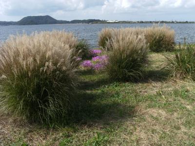 ループ麒麟獅子バスの湖山池ナチュラルガーデンというバス停で下車しました。ネットの事前情報では、地元鳥取に自生する山野草を中心にした自然な雰囲気の庭園という触れ込みだったのですが、むしろ人工的な雰囲気が強く感じられて、正直、がっかりです。ススキやオミナエシ、ツワブキなどの野草をあちこちに植えてはいるものの、その植え方があまりに整然として取ってつけたようですし、日本原産とは思えない園芸種の派手な植物が、ススキなどの間に不自然に入り混じっています。ポール・スミザーというイギリス人のガーデン・デザイナーが、庭園を監修しているようなのですが、自然と人工、日本と西洋が、中途半端にミックスされたちぐはぐな感じの庭園を、「自然な雰囲気」と称する感性は、いかにも外国人らしいなと思いました。