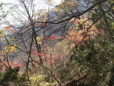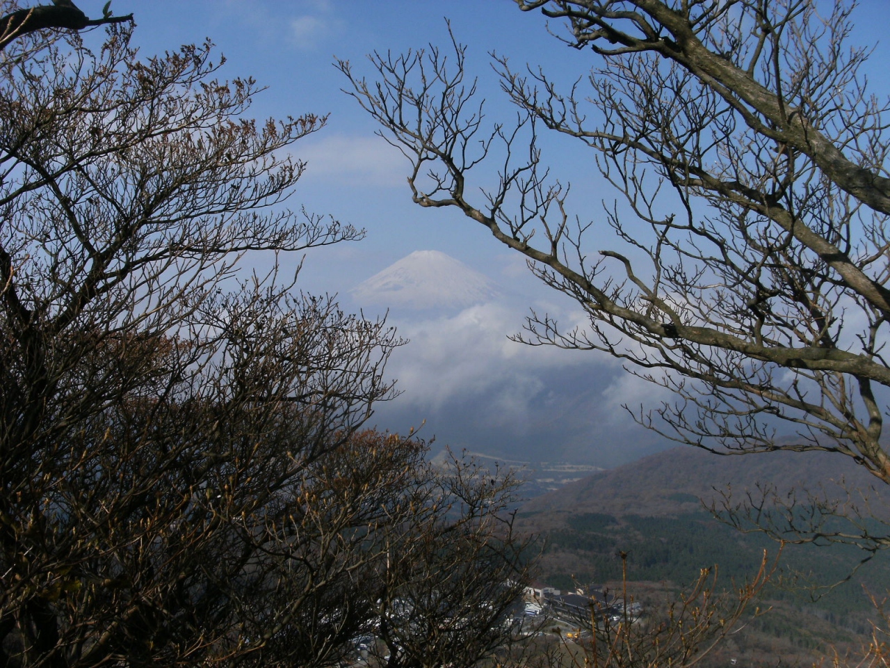 地図上にある標高1151mの早雲山にいく道はありませんが、ロープウェイ早雲山駅のすぐそばに、箱根駒ケ岳・神山・大涌谷に通じる登山道の入口があります。ここからの登山道は、標高1000mの大涌谷より標高が低いせいか、大涌谷周辺ではすっかり散り果てていた紅葉が、まだ多少残っていました。標高750mの登山口から標高差450mほどをひたすら登っていき稜線上に出ると、木々の間から富士山が見えるようになります。このあたりに、まず駒ケ岳に通じるお中道への分岐、次いで神山に登る道と大涌谷へ下る道との分岐があります。