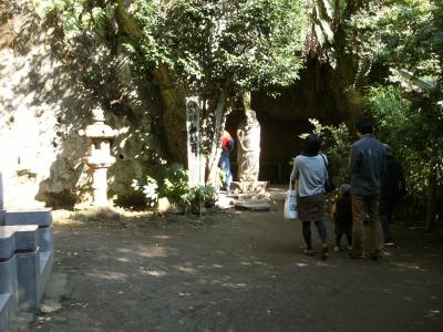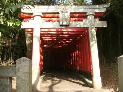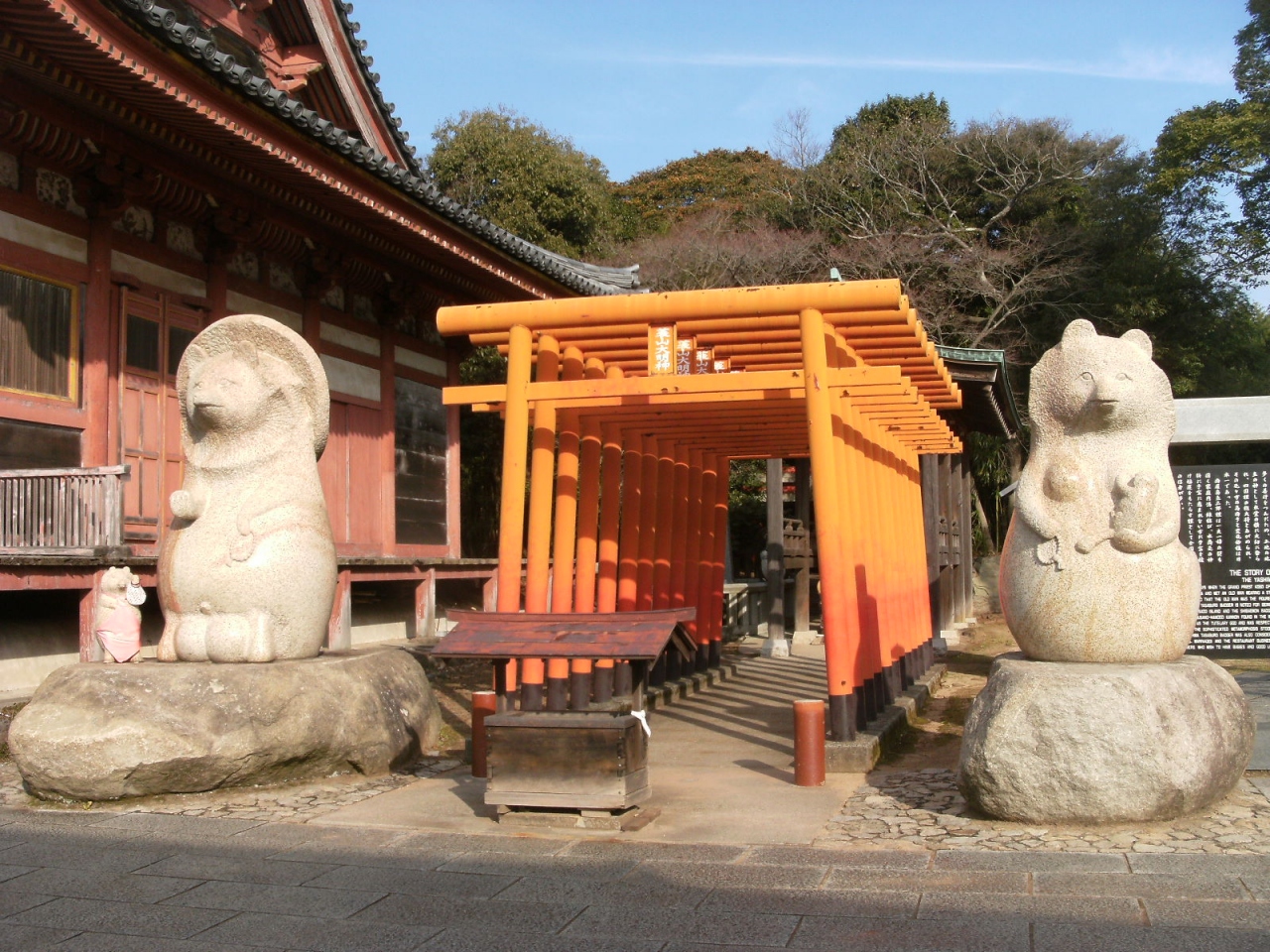 四国八十八ヶ所の第八十四番札所で、平安前期作の本尊と鎌倉末期の建築の本堂は国重要文化財という由緒あるお寺ですが、境内で一番目立っているのは、本堂横の大きな二体の狸の石像がお稲荷さんの狐のように鳥居の前に立つ蓑山大明神。弘法大師が屋島の山中で道に迷ったとき、蓑笠をかぶった老人の姿に化けた太三郎狸=蓑山大明神が、大師を道案内したという伝説から、屋島寺境内の守護神とされているとか。しかも、狸の蓑山大明神の祠の奥には、狐の屋島稲荷もあって、犬猿の仲と思われた狸と狐が、ここでは仲良く同居しています。