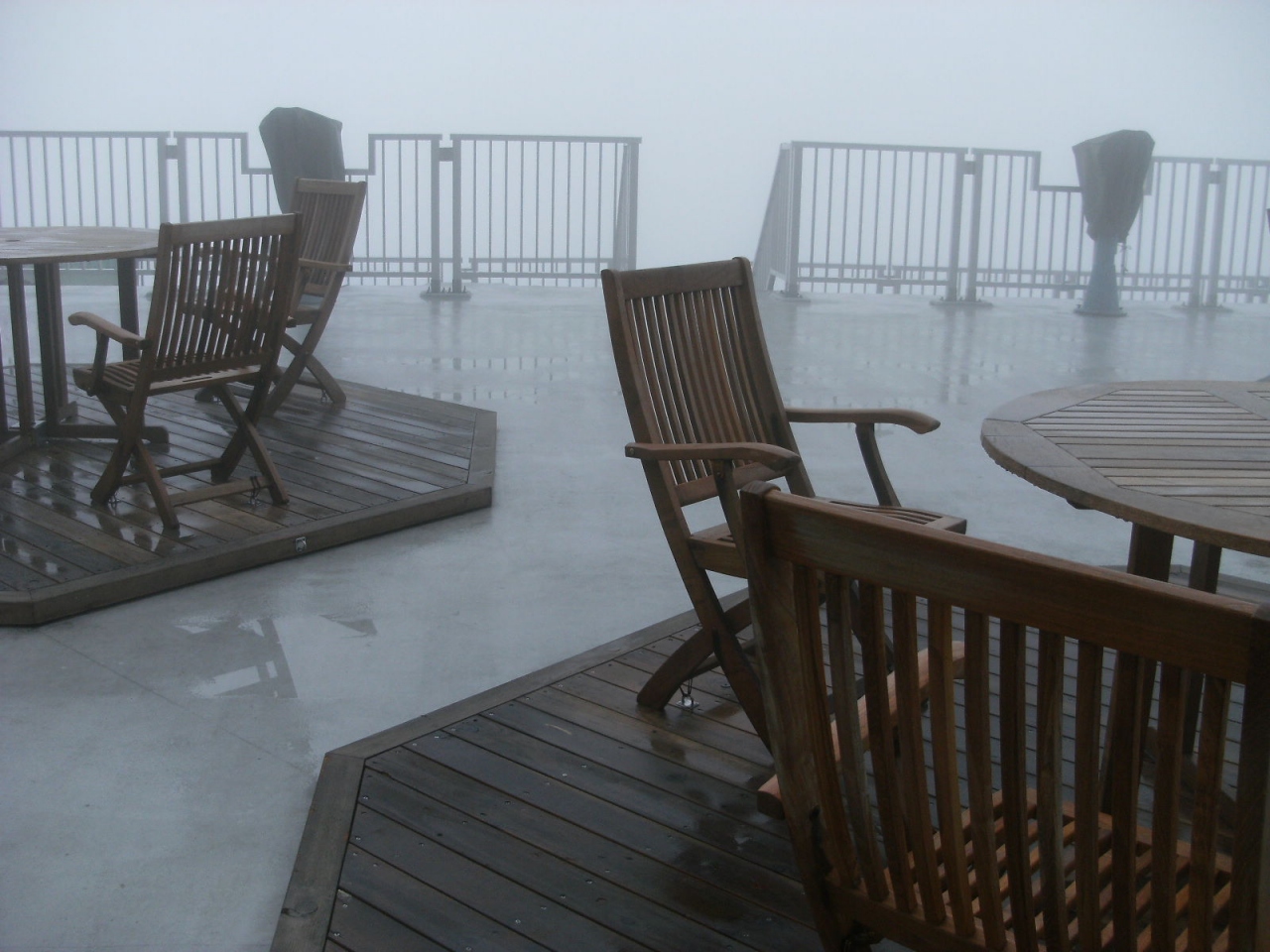 階段を上がって屋上に出たところが展望台ですが、悪天候のためほとんど何も見えませんでした。テーブルとイスがたくさんあるので、天気が良ければ、ここでゆっくりくつろぐこともできそうですが、雨上がりで濡れてて座ることもできません。