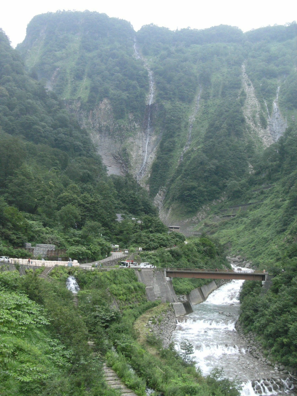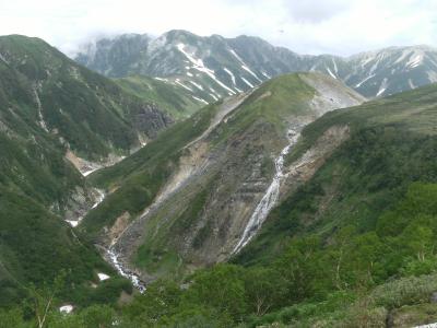 高原道路の天狗平少し手前(美女平発のバスの場合)のカーブが、ソーメン滝のビューポイントで、バスの車内アナウンスで紹介されます。天狗平から弥陀ヶ原への遊歩道からは見えないので、基本的にバスの車窓から見ることになりますが、歩いて滝のビューポイントまで行けば、ゆっくり見ることができます。遊歩道が車道に出会うところから車道をほんの少し歩くだけなので、弥陀ヶ原や室堂から天狗平に歩いて来たときや、天狗平で途中下車したときは、行って見ると良いでしょう。