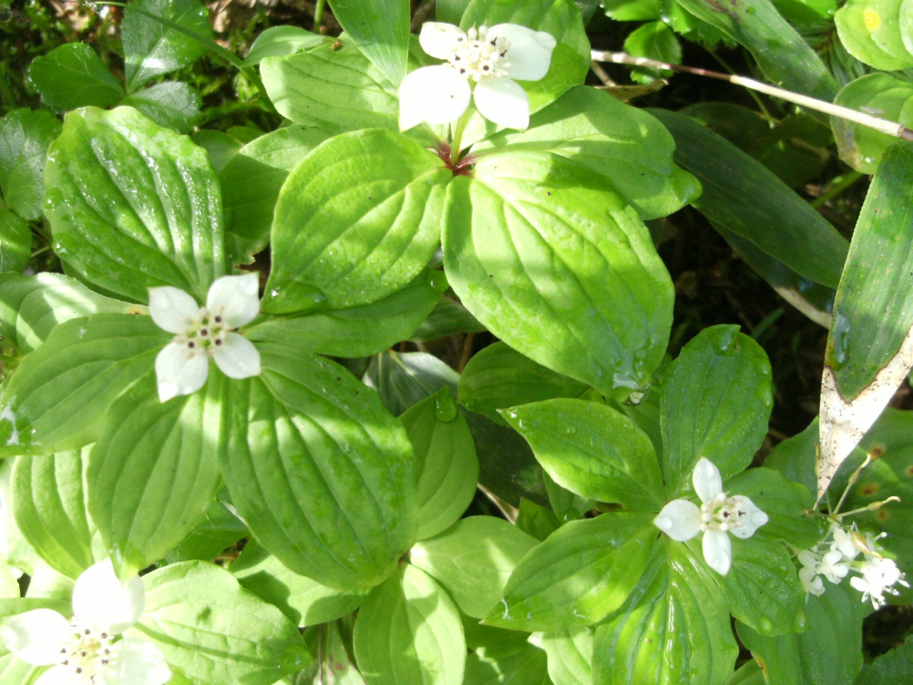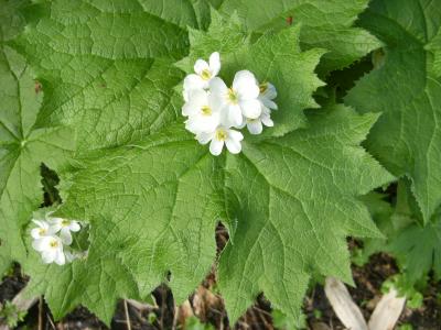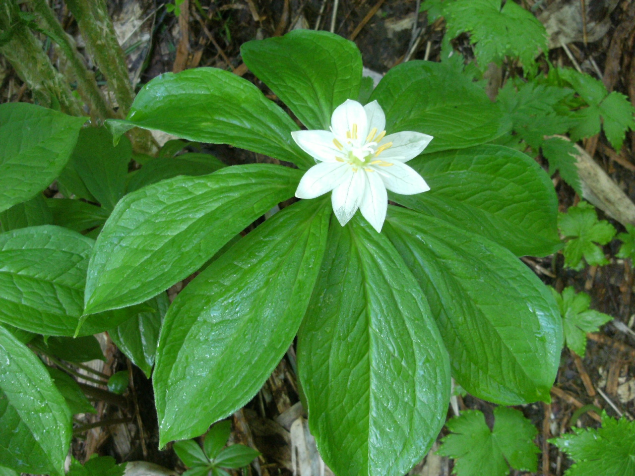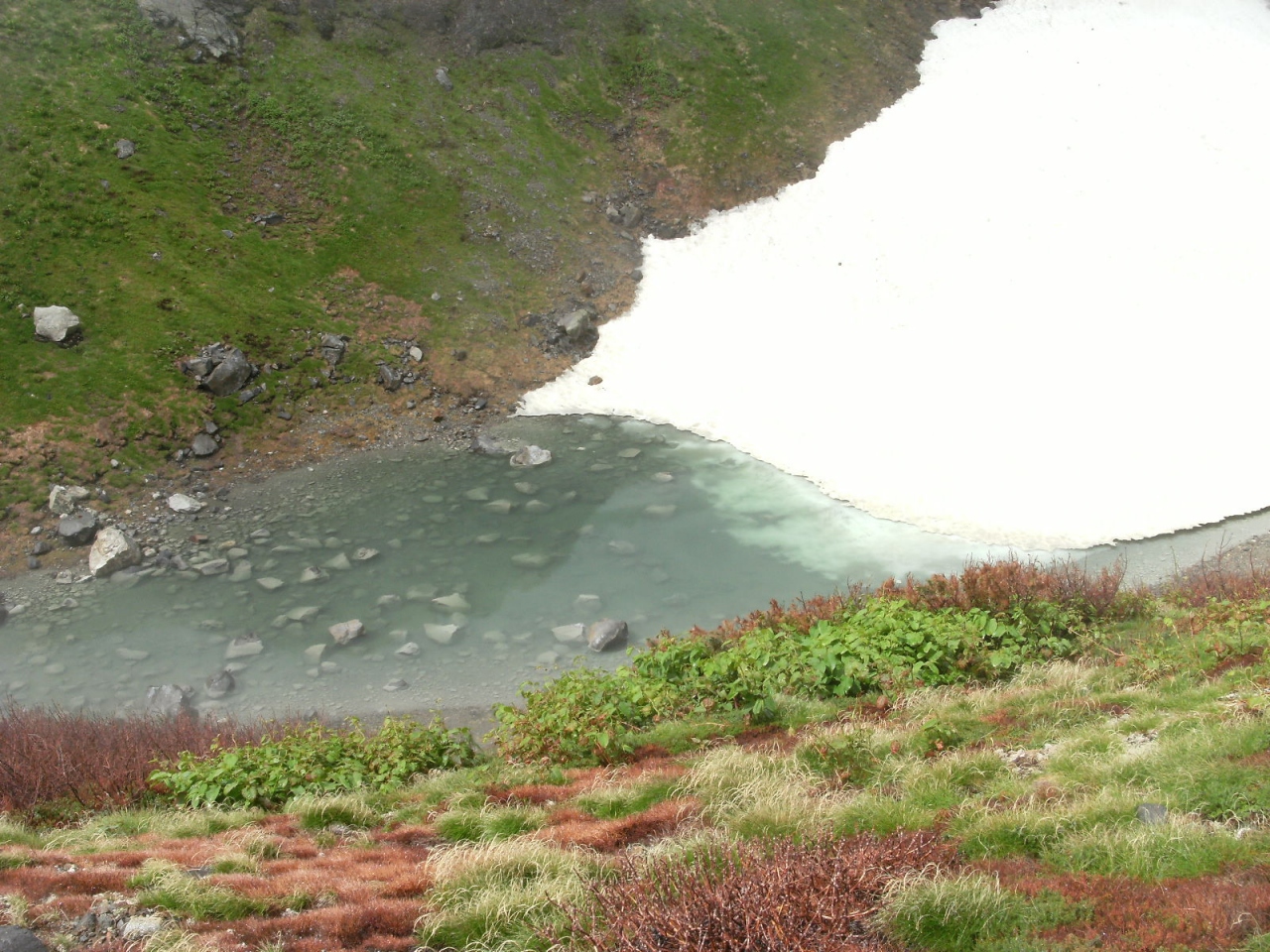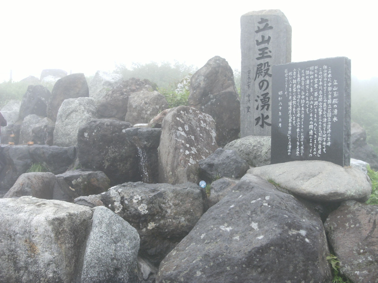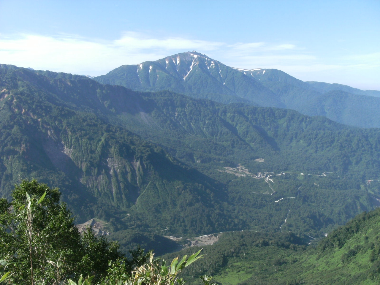 展望台への遊歩道の出発点は立山荘の敷地内にあります。展望台といっても、広場のようなものはなく、遊歩道のつきあたりで視界の開けたところがあるだけです。天気は良かったのですが、カルデラといわれても地質学に関しては門外漢なので、あまりピンときません。まあ薬師岳などの山々の眺めは良かったです。個人的には展望よりも、展望台までの遊歩道沿いに咲いていた花のほうが興味深かったです。キヌガサソウ、サンカヨウ、マイヅルソウ、ゴゼンタチバナなど、弥陀ヶ原や室堂周辺とはまた違った花がいろいろ見られました。