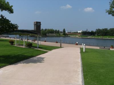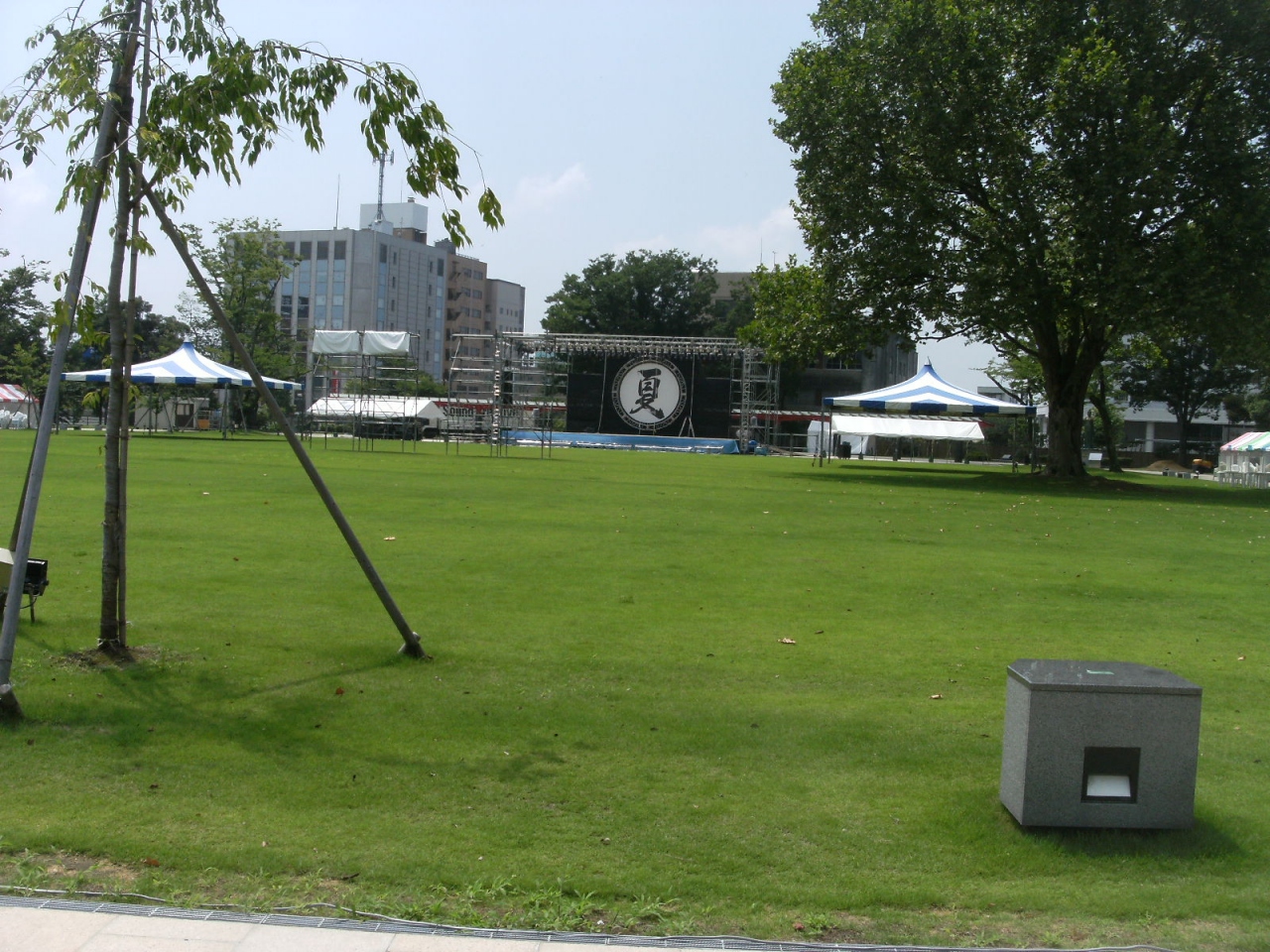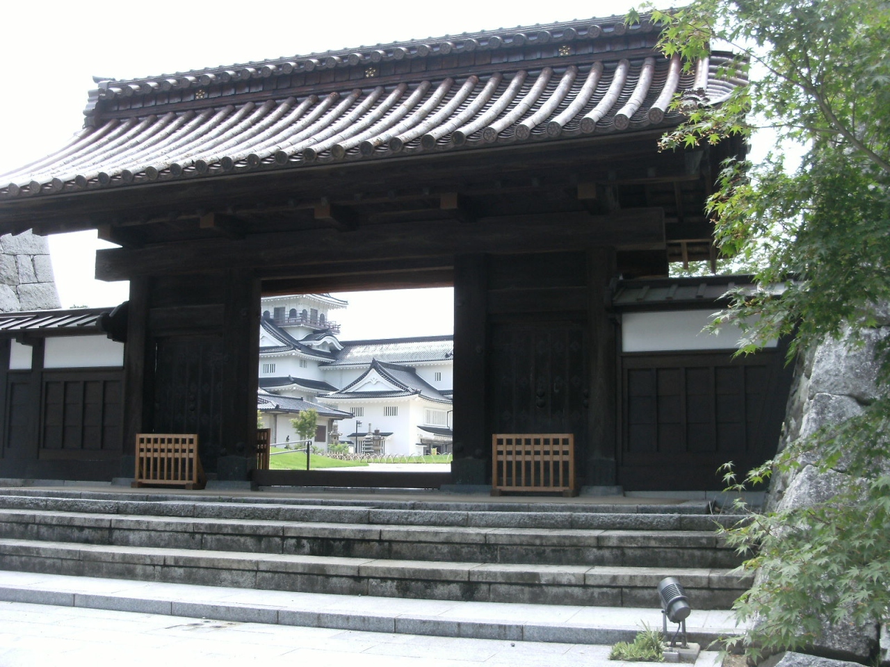 城跡は高台になっているのが一般的ですが、ここはほとんど周辺市街と高低差がありません。園内はとても広い広場になっていて、木陰がなく非常に暑いです。ただ、公園の縁の松川に面したところは、木陰があって夏でもくつろげますし、蒸気機関車が展示されていたり、きれいな庭もあります。また、園内には佐藤記念美術館、郷土博物館(天守閣)があります。博物館になっている天守閣は、見た目にもわかるレプリカですが、北側の入口になっている千歳御門は、もともと城門ではなく城主の隠居所(千歳御殿)の門だったとはいえ、一応、幕末に建てられた当時のもので市重文です。