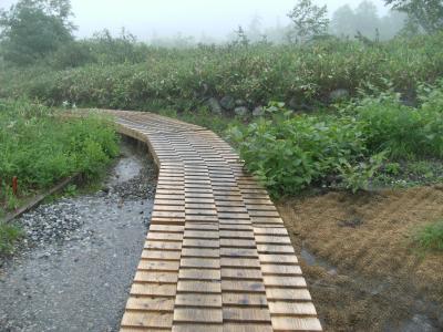 周遊コースの木道はタイル状に細かい滑り止めがついていて、雨の日でも安全に歩くことができます。ただし、周遊コースから分岐して天狗平に向かう一の谷道・獅子ヶ鼻コースは、木道の滑り止めが少なく、一部が傾いたり折れたりしていますし、草丈が高く足に当たってびしょ濡れになるうえ、沢や岩場を通過する箇所もあるので、雨の日や雨上がりは、しっかりした登山装備でないと歩けません。悪天候時は装備万全の経験者でも危険だと思います。