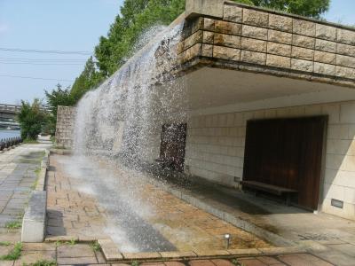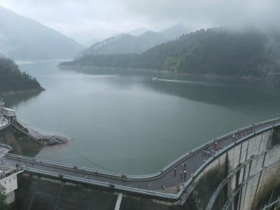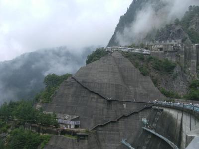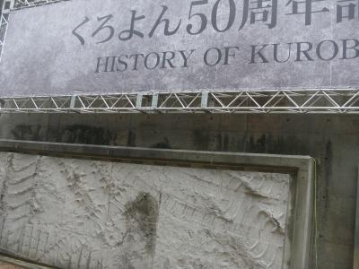 ダムの堰堤から階段を下りて行ったところにある低い展望台で、ダムの放水口を間近に見ることができます。あいにく前日の大雨で放水が中止されていましたが、放水中は見えない放水口やその周囲の構造がよく見えて、これはこれで面白かったです。また現在(7/20~8/31)、展望台上の倉庫跡のようなところで「くろよん50周年 黒部の物語」の企画展示を行っており、当時の記録映像などで、黒部の電源開発の歴史を紹介しています。入場無料です。