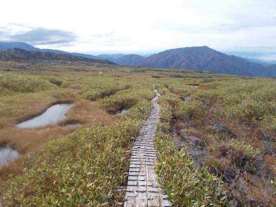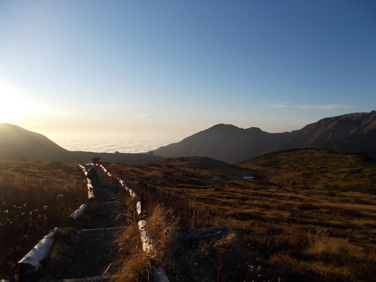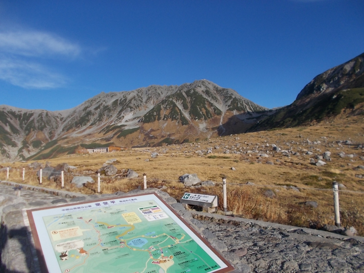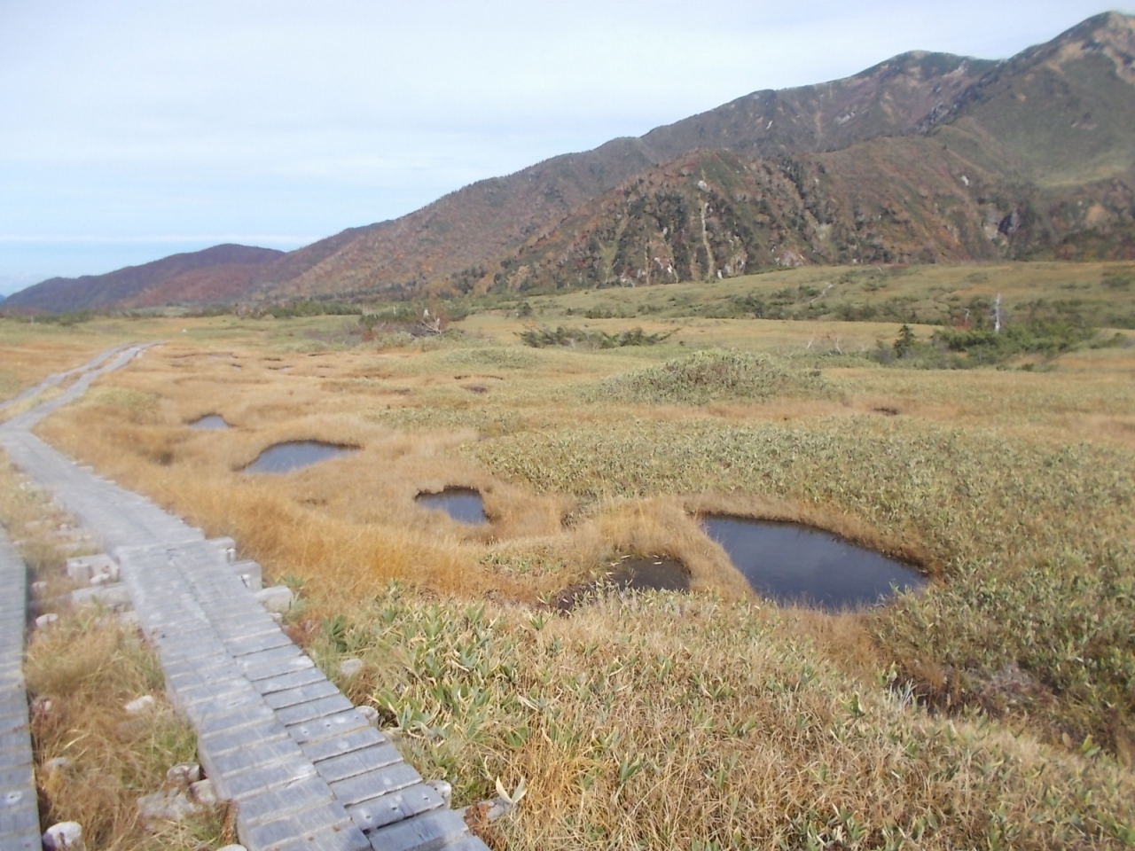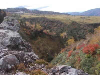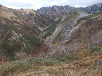 弥陀ヶ原は室堂などとは比較にならないくらい人が少なく静かです。弥陀ヶ原から天狗平まで3時間半ほどかけて歩いた中ですれ違ったのはほんの数人でした。以前夏に来たときよりも今回のほうがさらに人が少なかった印象です。弥陀ヶ原の草原は、この時期枯れ草ばかりで見栄えしませんが、樹木のある一の谷のあたりは紅葉がきれいでした。平坦な弥陀ヶ原は、歩きやすい反面、景観のおもしろみに欠けるところがありますが、獅子ヶ鼻の岩の上に登って見下ろすと、弥陀ヶ原の平坦さがいかに驚異的かわかります。
