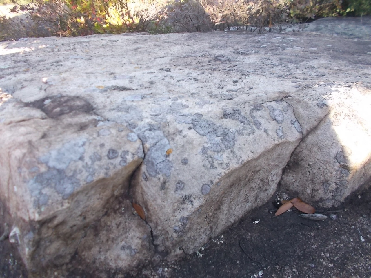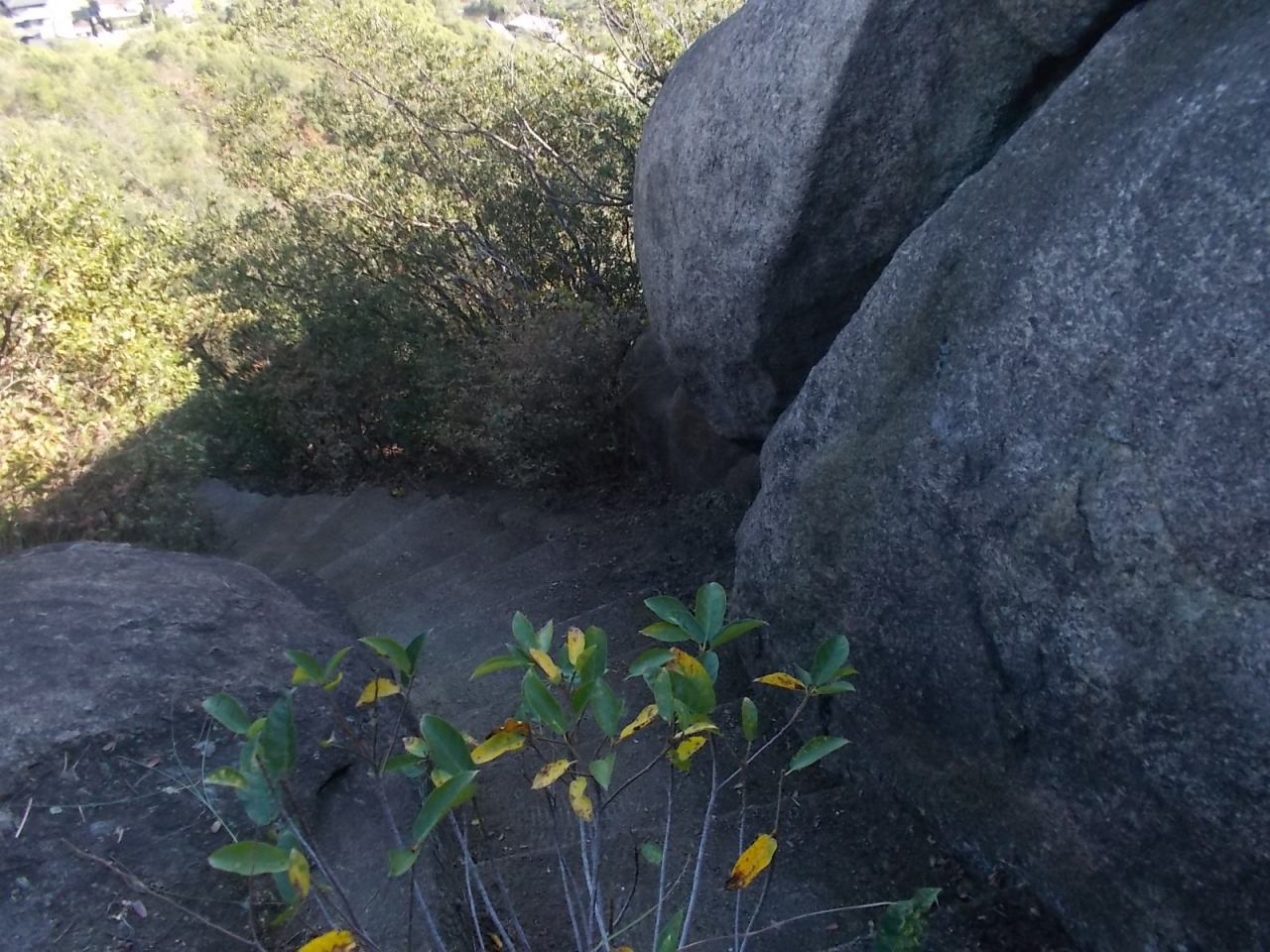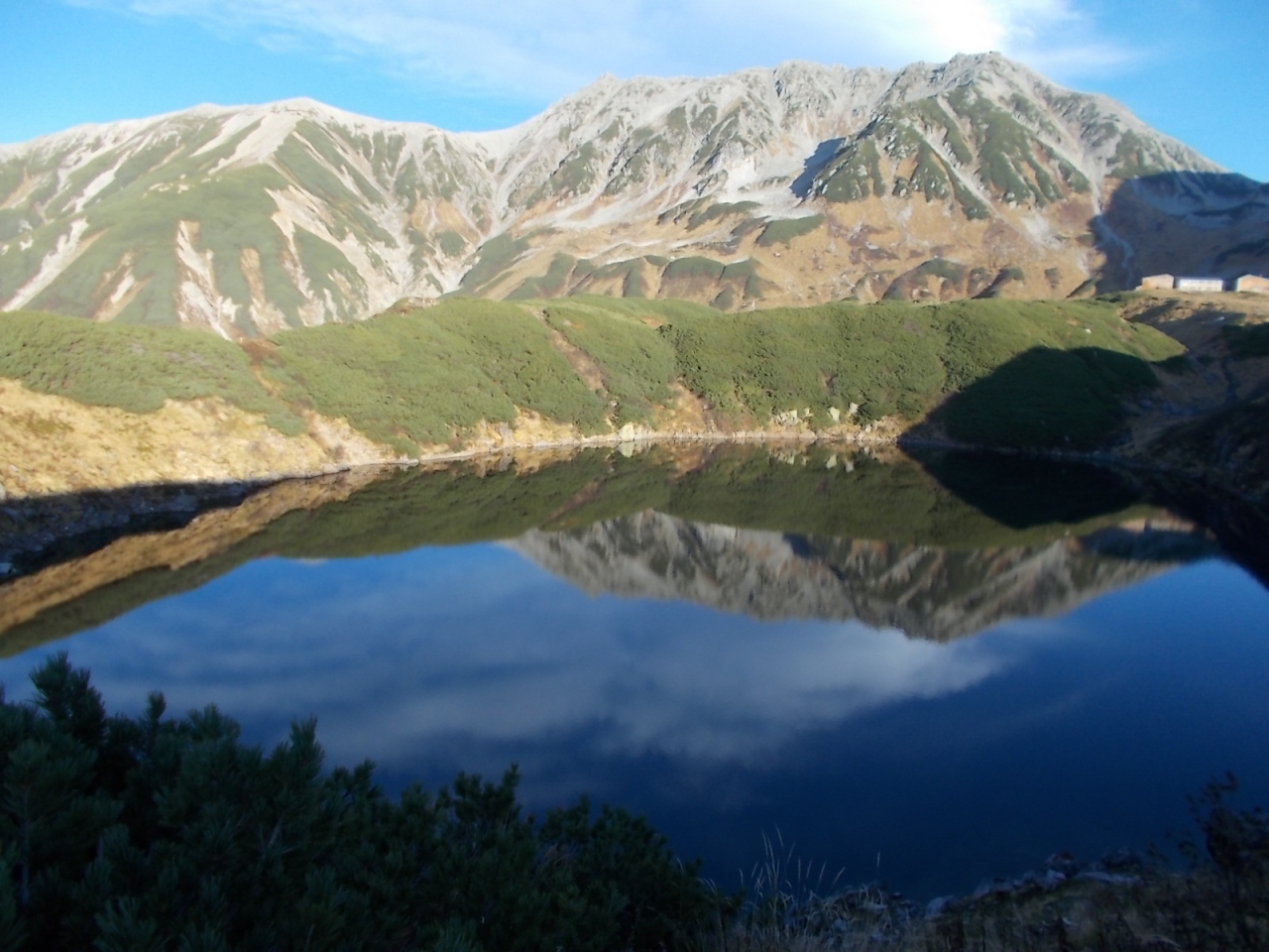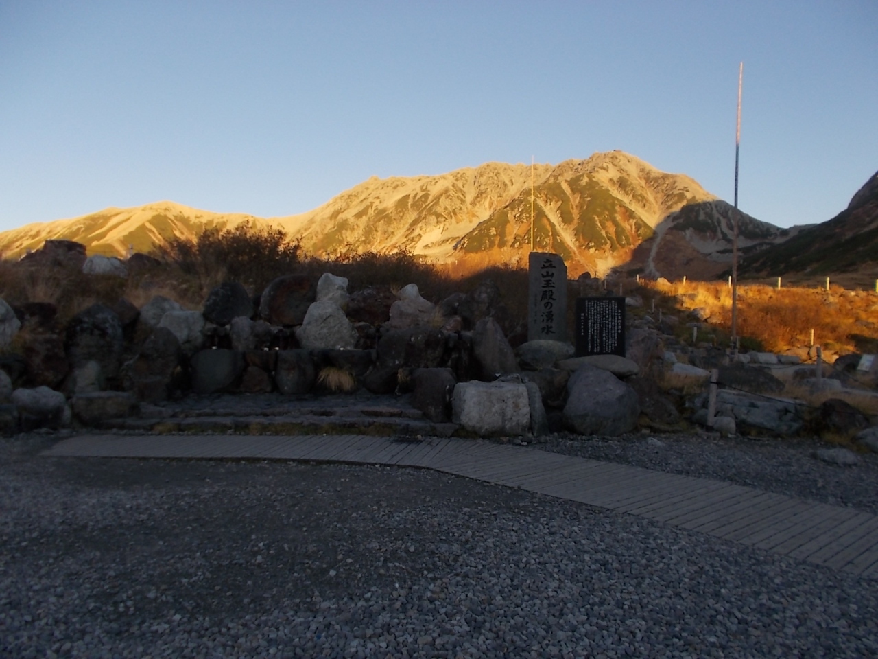 弥陀ヶ原は室堂などとは比較にならないくらい人が少なく静かです。弥陀ヶ原から天狗平まで3時間半ほどかけて歩いた中ですれ違ったのはほんの数人でした。以前夏に来たときよりも今回のほうがさらに人が少なかった印象です。弥陀ヶ原の草原は、この時期枯れ草ばかりで見栄えしませんが、樹木のある一の谷のあたりは紅葉がきれいでした。平坦な弥陀ヶ原は、歩きやすい反面、景観のおもしろみに欠けるところがありますが、獅子ヶ鼻の岩の上に登って見下ろすと、弥陀ヶ原の平坦さがいかに驚異的かわかります。