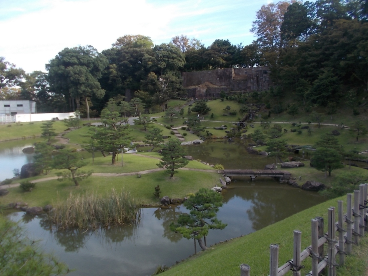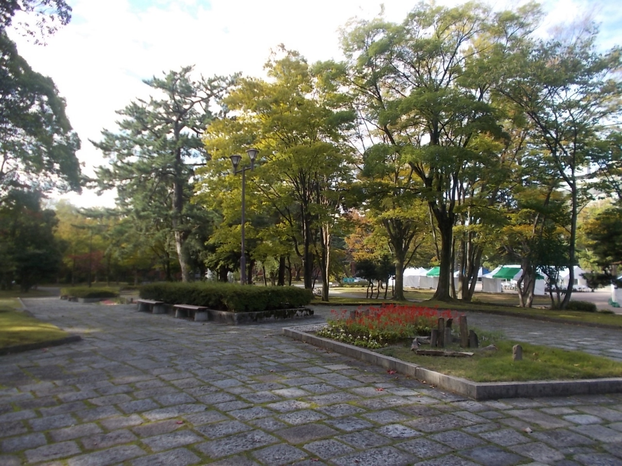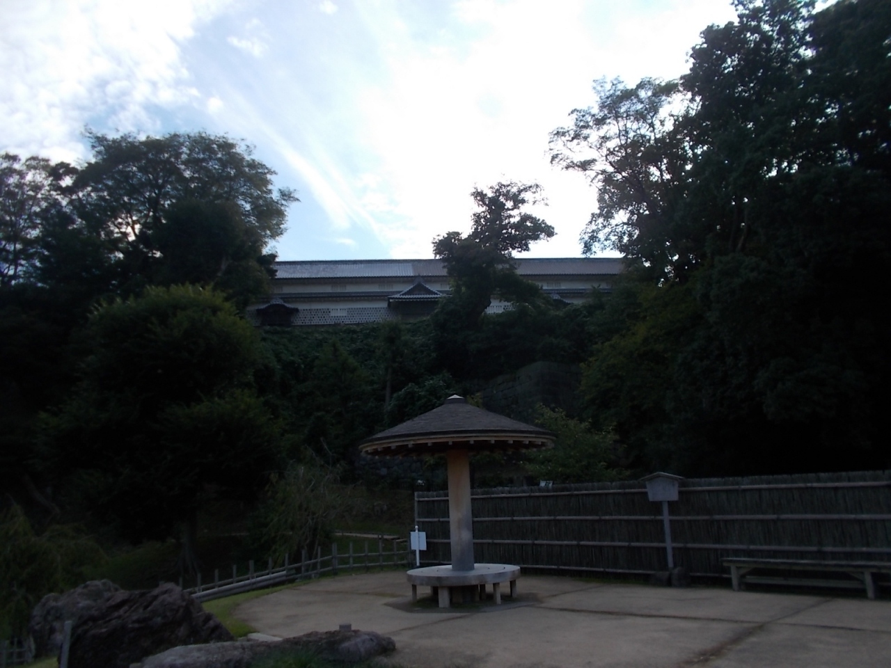 金沢城の玉泉院丸口からだと道路を渡ってすぐそこといった場所になります。かなり広い公園でイベント会場になることが多いらしく、自分が訪れたときも多数のテントが設営されていて、なにやらイベントの準備をしている人たちがいました。