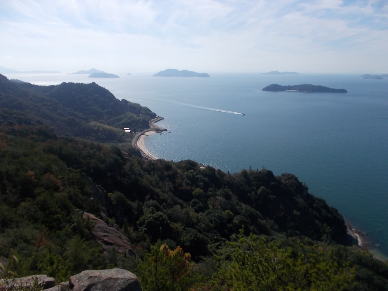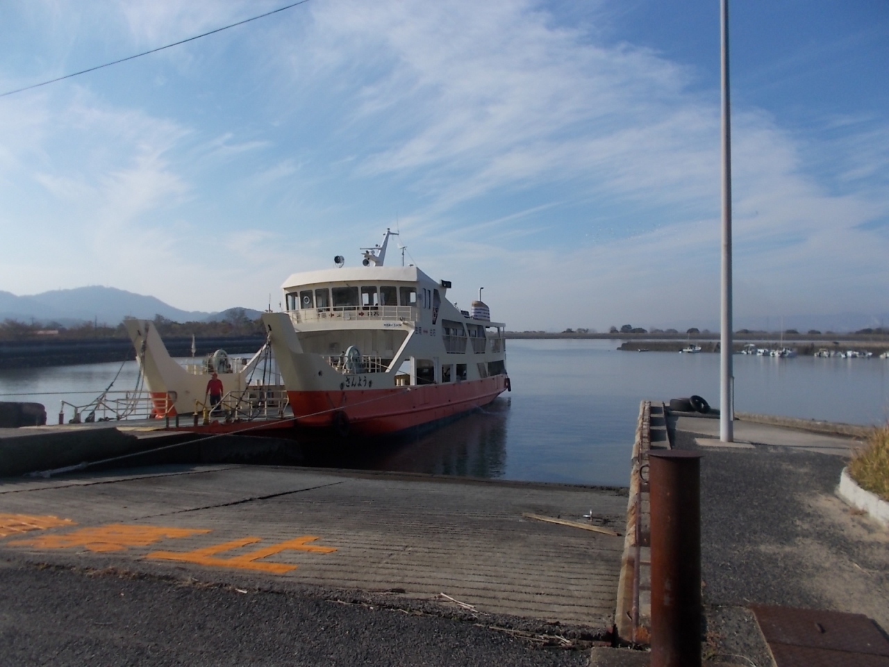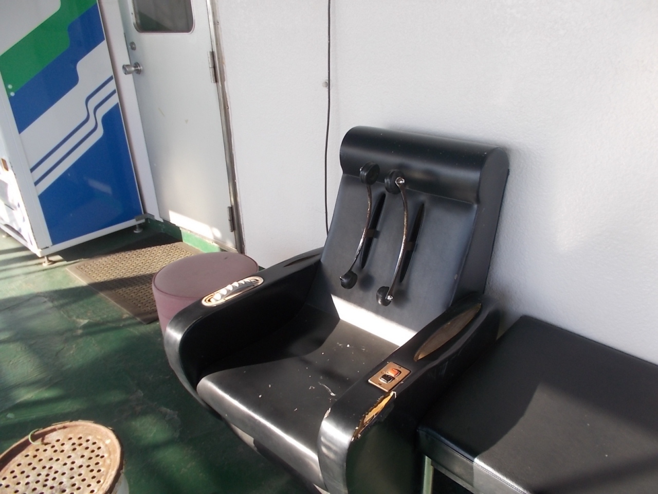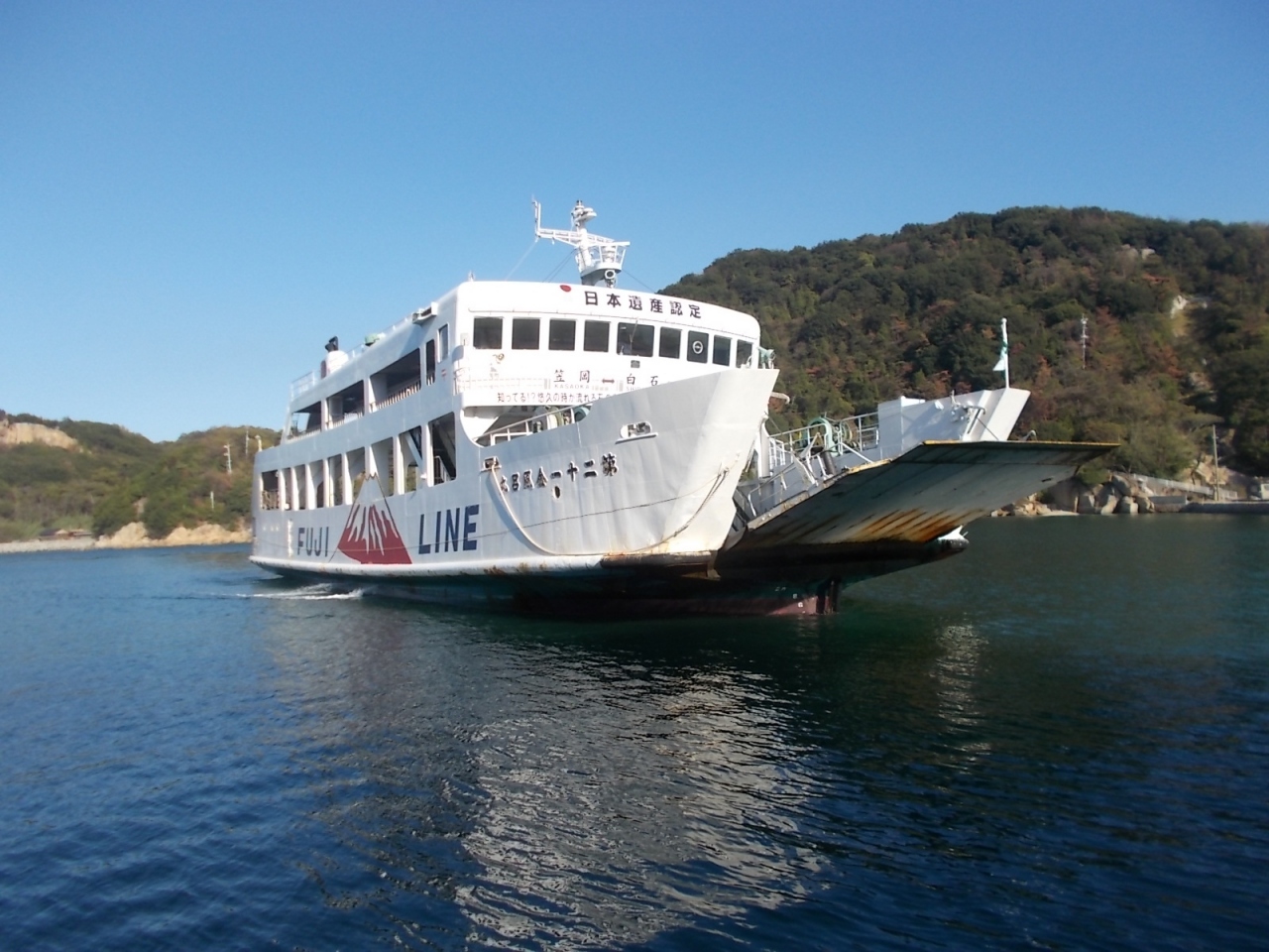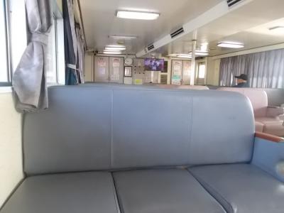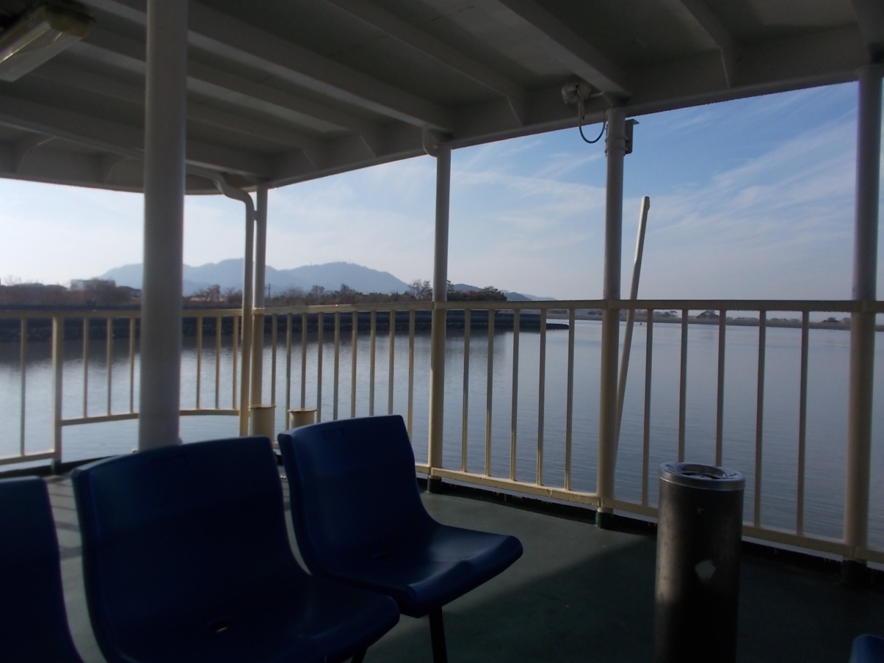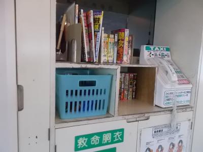 笠岡~白石島~北木島間を運航しているフェリーの白石島→笠岡間を利用。白石島での停泊時間はほぼなく、接岸して乗客を乗せたら即出航していました。第二十一金風呂丸はやや大型の船で、船内にマンガ本があったり、タクシー専用の無料電話機があったり、外のデッキにマッサージチェアがあったりと、いろいろ設備が充実してました。マッサージチェアはかなり古いものでしたが、コイン式ではなく無料で、スイッチを入れたらちゃんと動きました。