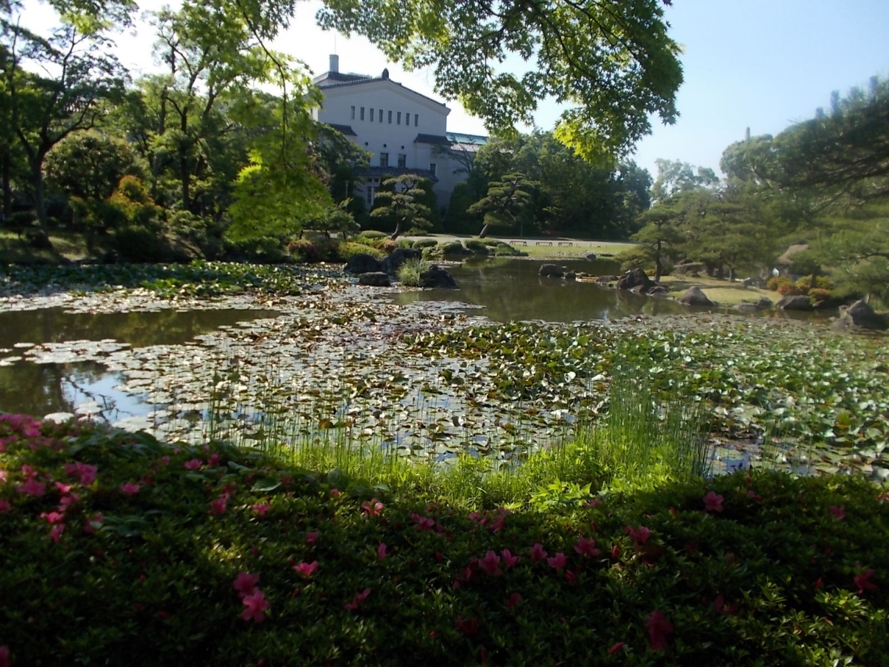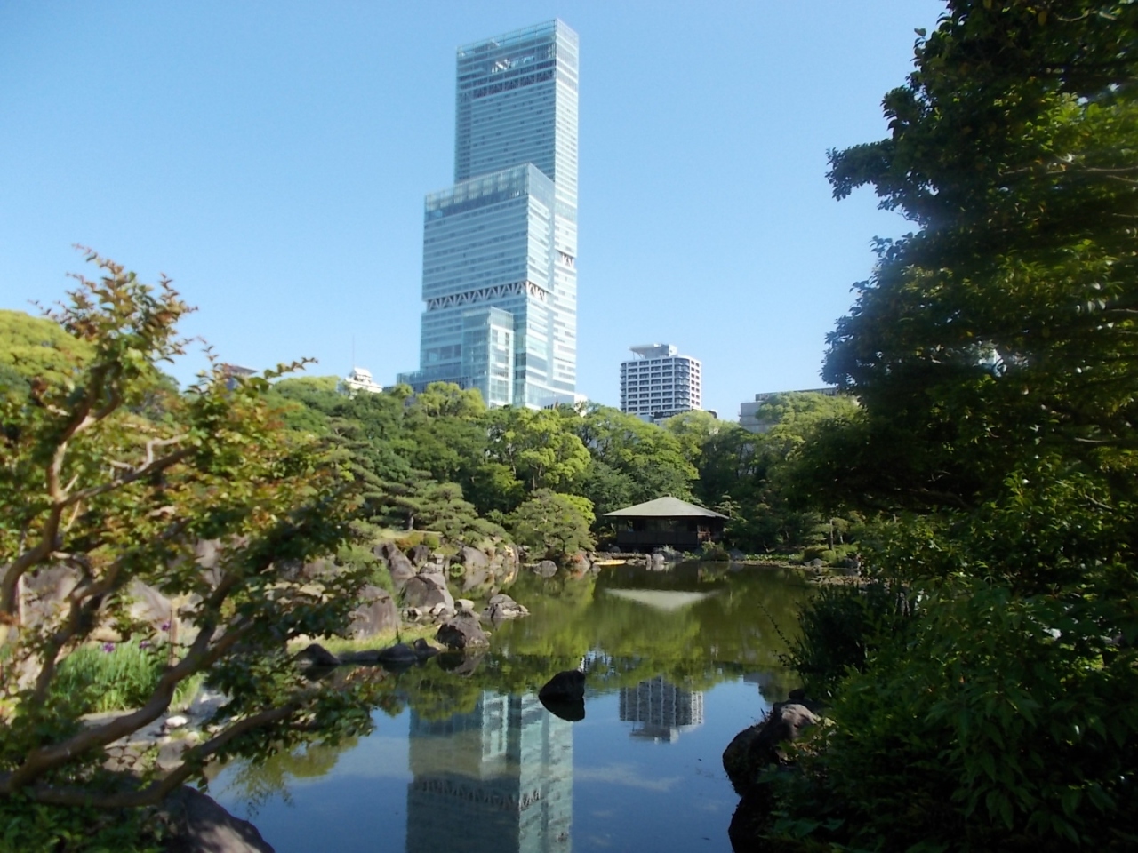 天王寺公園内には大正時代に住友家の庭園としてつくられた慶沢園という大きな日本庭園もあります。慶沢園は有料(150円)ですが、料金を払って見るだけの価値はあると思います。池の向こうに大阪市立美術館やアベノハルカスが借景となって、方向によっていろんな景色が楽しめます。