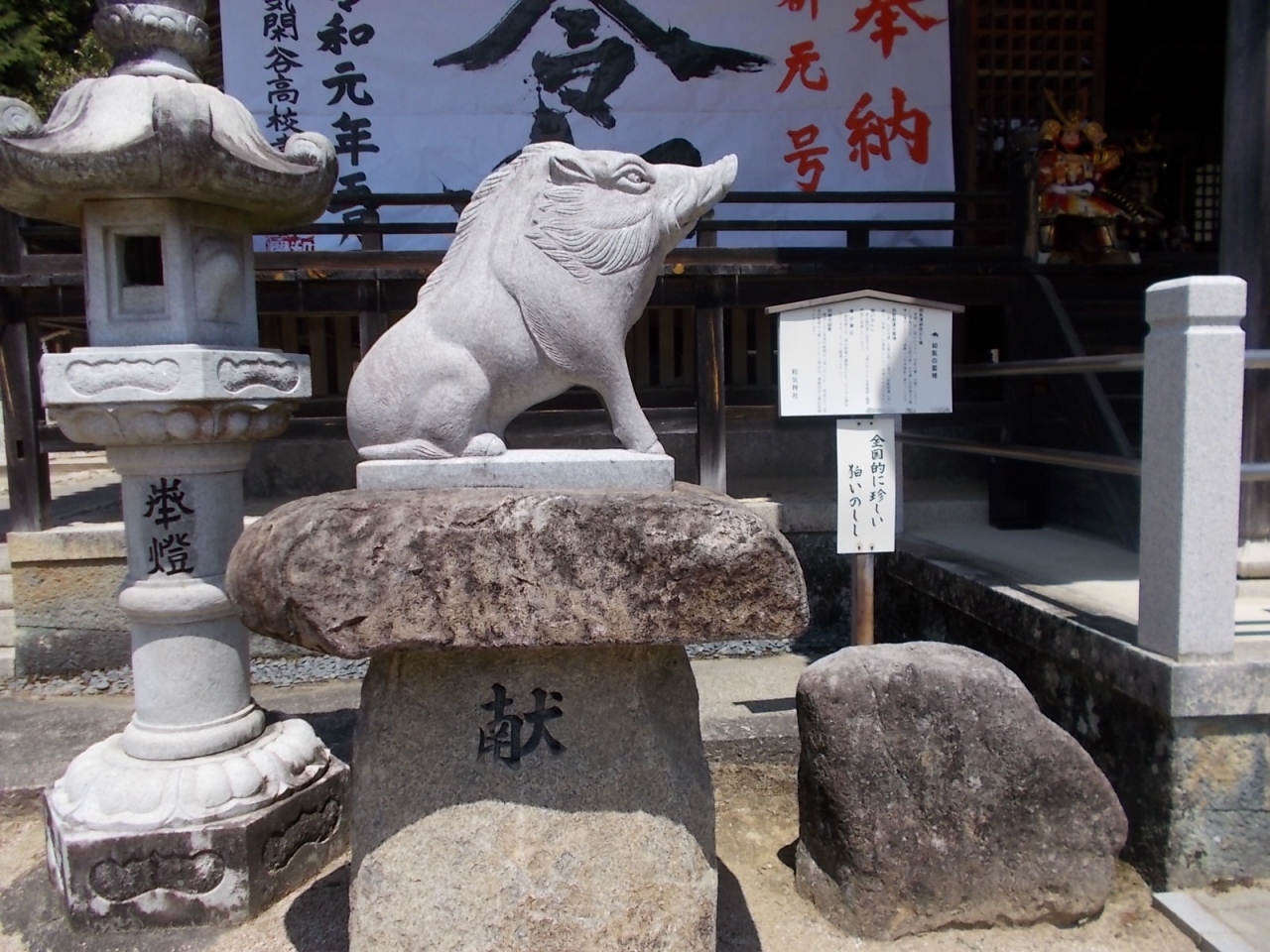 神社の祭神になっている和気清麻呂を救ったのがイノシシだということで、神使がイノシシになっており、狛犬ならぬ狛イノシシをはじめ神社のあちこちにイノシシがあります。町指定文化財になっている明治18年建立の本殿にもイノシシの彫刻がありました。藤公園の藤の見物客が大勢参拝に訪れていてにぎやかでしたが、神社の裏山はカエデの木が多いようで、秋の紅葉の時期に来るのも良さそうだと思いました。
