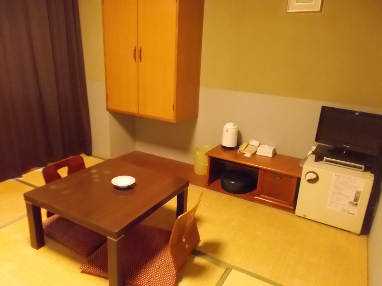 バス・トイレつきの6畳の和室が1名素泊まり3300円と格安。喫煙の部屋しか空いてなかったので喫煙で予約しましたが、煙草臭などはまったく感じず快適に過ごせました。窓を全開にできるのも、真夏にはあまり意味ないかも知れませんが、季節によってはメリットがあると思います。テレビは地上波だけでなくBSもうつります。また、部屋の照明をリモコンで操作でき便利です。ただ、エアコンにはリモコンがありません。また、部屋のコンセントが1つしか空いておらず、そこはちょっと不便に感じました。あと多くのビジネスホテルが共通して抱える問題ではありますが、バスタブの排水が浴室の床に漏れて水浸しになります。