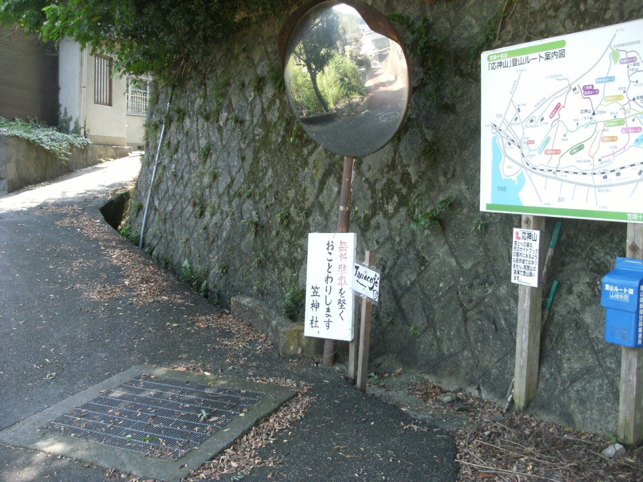 応神天皇がこの山を訪れて狩をしているとき風で笠が吹き飛ばされたのを、お供の鴨別命は「この山の神が獲物を奉ろうとしているしるしです」と進言し、その言葉通り多くの獲物があったので、よろこんだ天皇は鴨別命に「笠」の名を与えた、という伝説が平安初期編纂の「新撰姓氏録」に笠氏の由来として書かれています。応神天皇ゆかりの伝説の地ということで昭和18年に国指定の名勝になっていますが、ごく平凡な里山で訪れる人は少なく、真夏は登山道が蜘蛛の巣だらけになっているうえ、草が生い茂って一部のルートは通行困難です。ただ、駅のすぐ近くに登山口があって手軽に登れる山ですし、道標はきちんと整備されており、各ルートの登山口に印刷したルートマップが備え付けてあります。