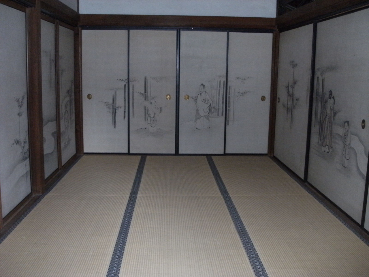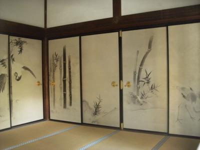 たくさんの部屋が並んでおり、それぞれに狩野山楽や渡辺始興のすばらしい襖絵があって、見ごたえがあります。どれもシンプルな墨絵なのですが、なんともいえず風流で格調高い感じがします。絵は美術館で展示されるのを見るより、部屋の襖のような本来あるべき場所のあるべき姿で見るほうが、よりその絵本来の魅力を味わえると思います。