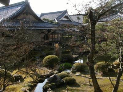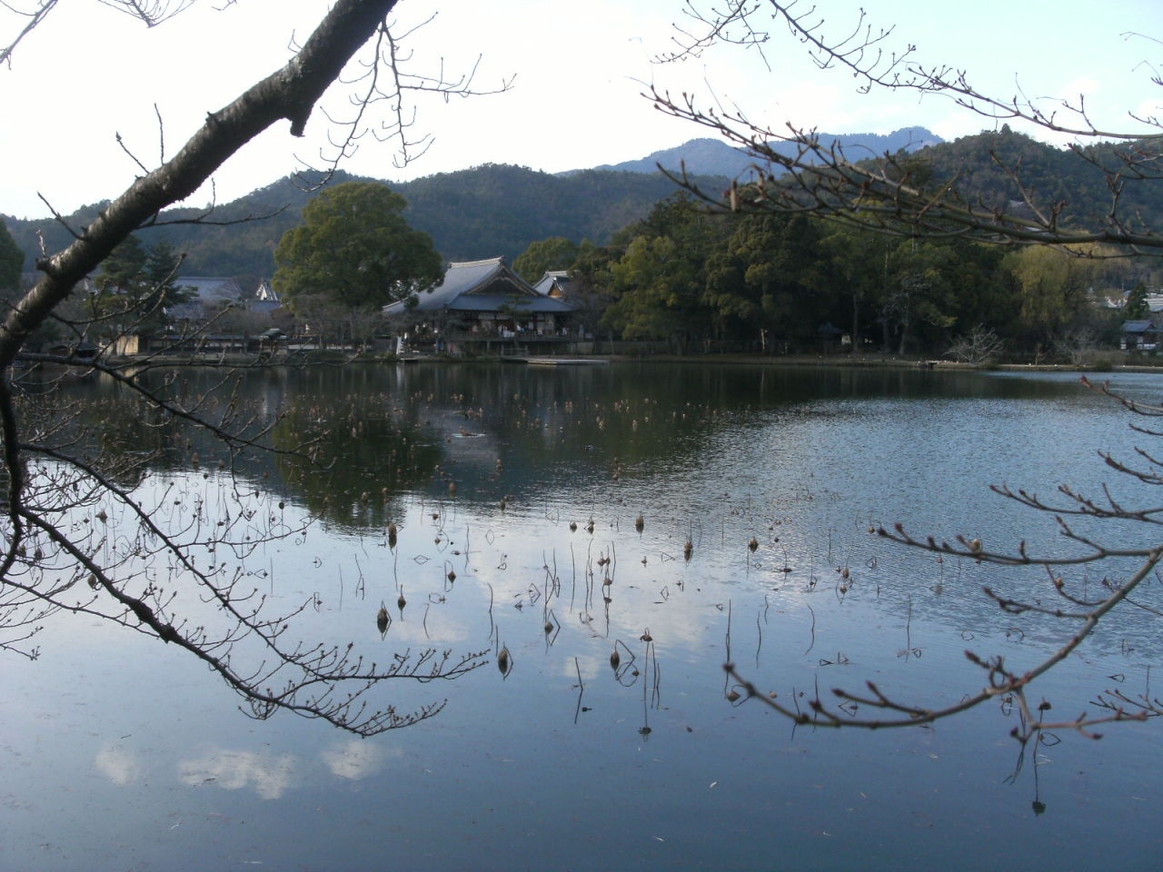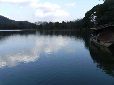 大覚寺の一部ですが、池には拝観料なしで出入できます。なかなか大きな池で、適当なところで引き返すか、ぐるっと一周するか迷いましたが、人が少なく静かなうえ、景色が良くて、歩いていてとても気持ち良かったので、結局、一周しました。桜や楓の木が池の畔にたくさん植えられていたので、春の花見や秋の紅葉の時期に来れば、わたしが訪れた冬と違って、華やかで美しい景観が見られそうです。蓮の枯れた跡もたくさんあったので、夏には蓮の花が見られるでしょう。個人的には静かな冬も魅力的だと思います。