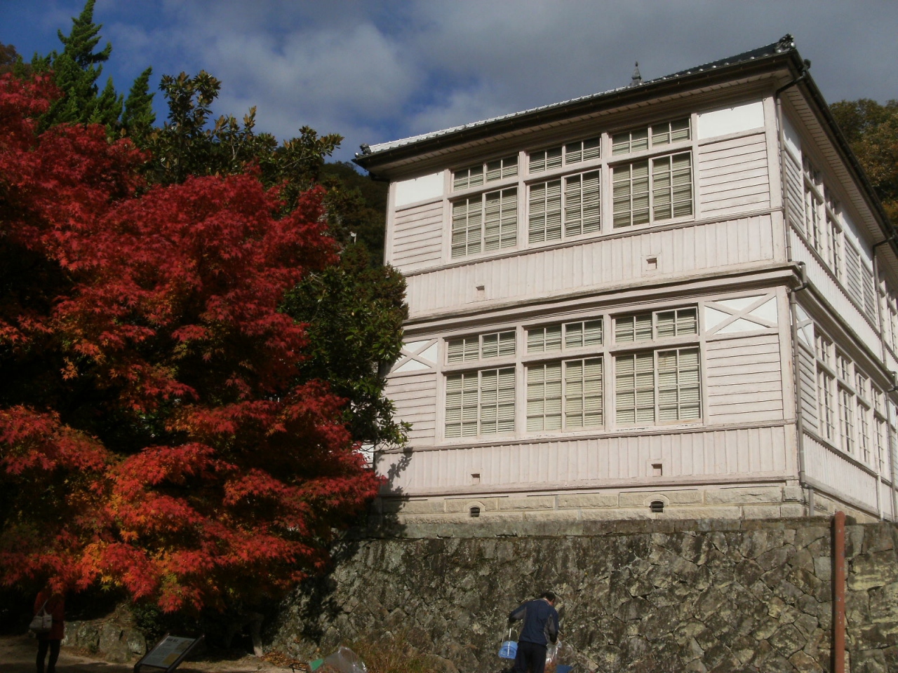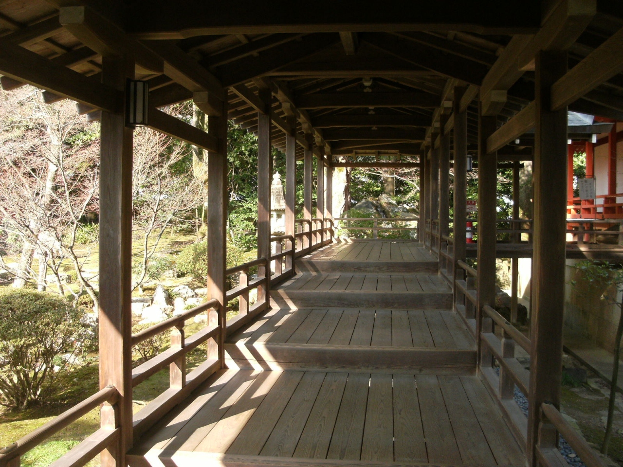 朱塗りの良く目立つ建物で、大覚寺の他の建物よりほんの少し高いところにあり、霊明殿に通じる回廊は階段状になっています。霊明殿、庭湖館(通常立入禁止)、秩父宮御殿(通常立入禁止)の三つの建物に囲まれるように、小さな池と滝のある庭があり、回廊や霊明殿からの眺めが良いです。楓の木が多いようでしたので、紅葉の時期が一番きれいだと思います。