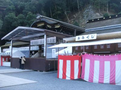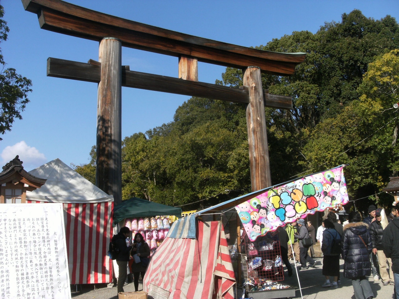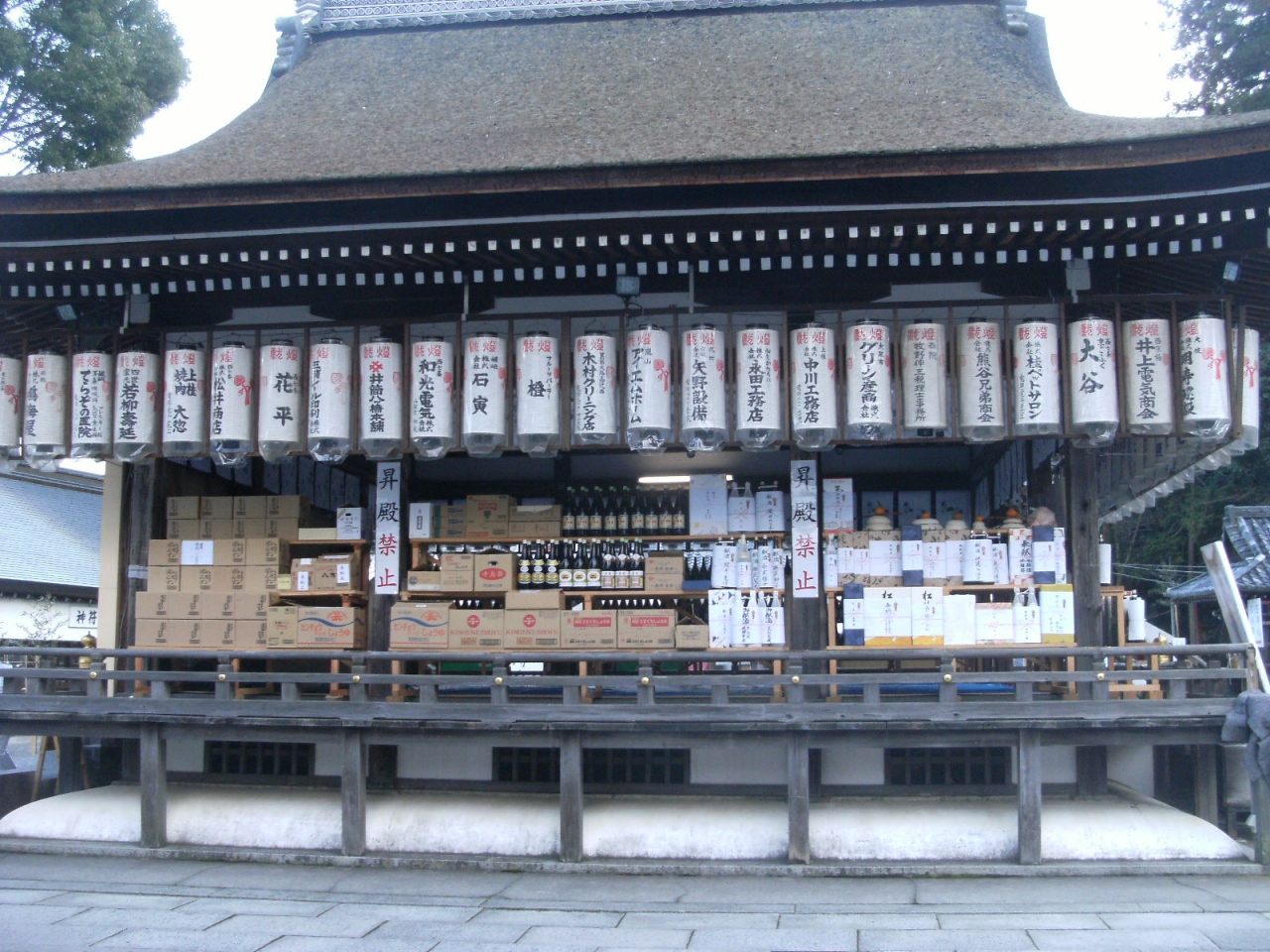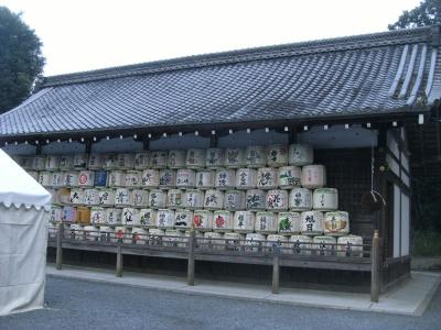 大晦日だったので正月のお供えの酒樽や酒瓶が大量に積まれており、さすが有名な酒造りの神様だなと思いました。正月になれば初詣客で混雑するのでしょうが、大晦日は訪れる人もまばらで静かなもの。正月仕様の幕や仮設の賽銭箱のため社殿が隠れて一部見えなかったのは少し残念でした。参道にはいろんな屋台がずらっと並んで開店準備中でした。