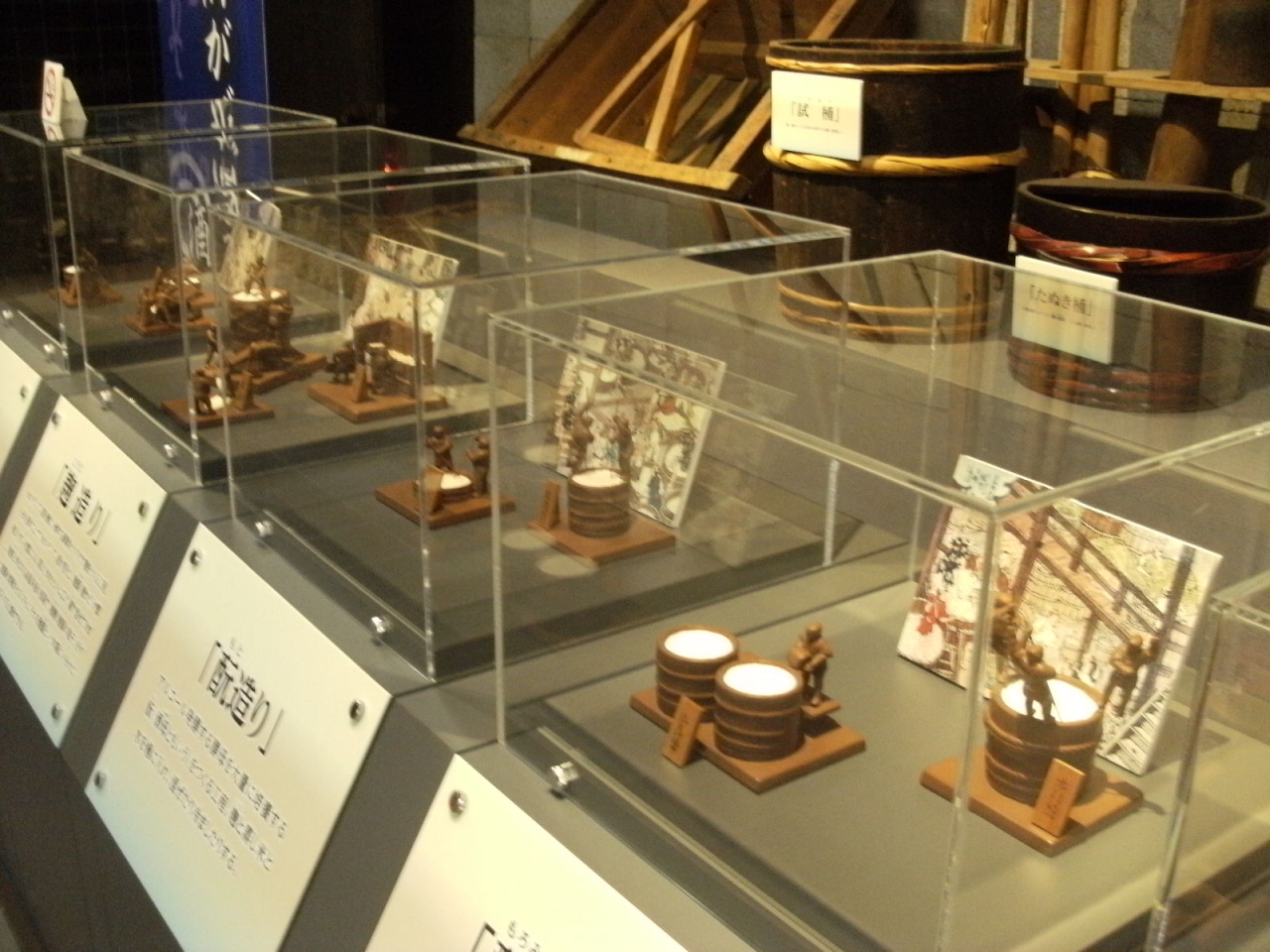 なかなかおもしろい外観の資料館ですが、無料施設であるだけに、展示内容はあまり充実しているとはいえません。酒造りの道具と、酒造りの工程を説明するためのミニチュア人形が展示されています。田舎町の民俗博物館のような雰囲気です。