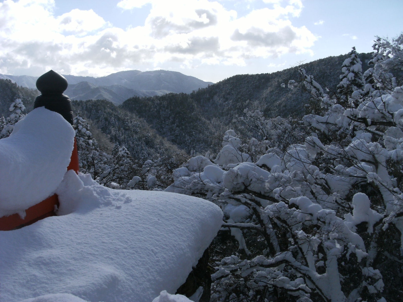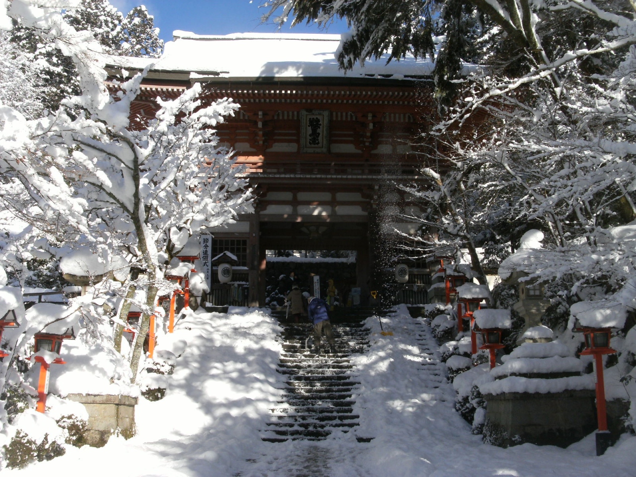 本殿金堂から木の根道を通って貴船神社に抜ける予定でしたが、積雪のため本殿金堂から先が通行止めになっていました。貴船側にある西門も通行止め。雪景色を見るために、わざわざ積雪した日を狙って訪れる人も少なくないかと思いますが、積雪が多いと一部区間が通行止めになるので要注意です。仁王門と本殿金堂の標高差は160mしかなく、しかも石段と舗装道の参道ですから、これを往復するだけでは物足りない印象は否めません。まあ、雪景色の美しさは、それなりに堪能しましたけど…。