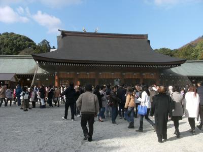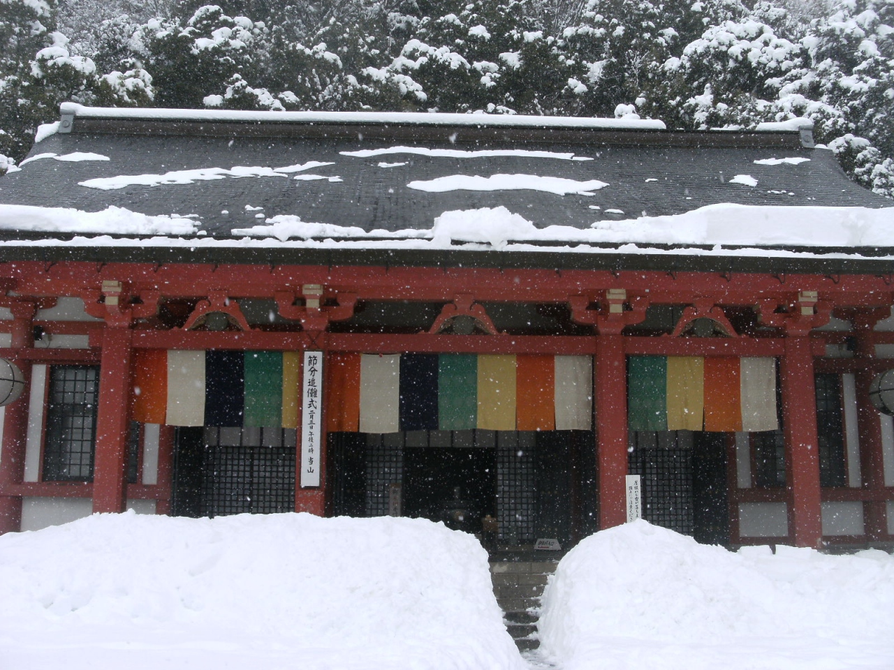 本殿参拝中、突然、地響きをともなってものすごい音がしてびっくりしました。どうやら屋根に積もっていた雪が落ちたようです。屋根が大きい分、積もった雪の量も多いですから、もし直撃を食らったら、ただではすまないでしょう。以前見た宮尾登美子原作のテレビドラマ「蔵」の冒頭に、主人公の祖父が、蔵の屋根からの落雪の直撃を受けて死ぬというシーンがあったのを思い出しました。雪の日の参拝は要注意です。