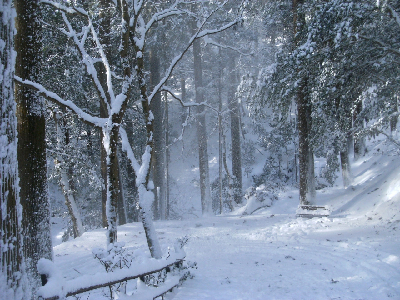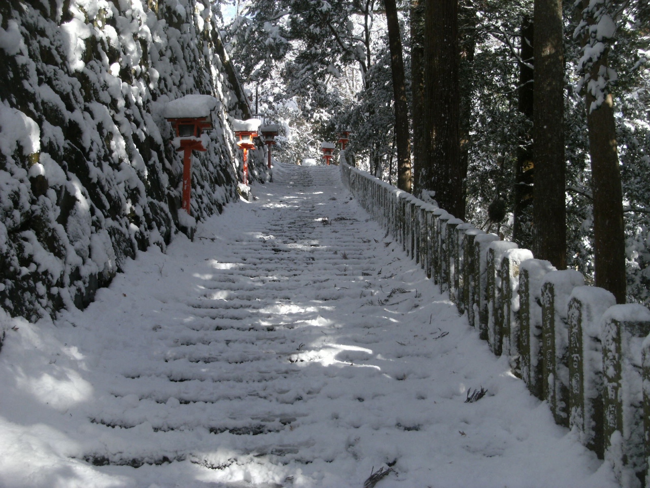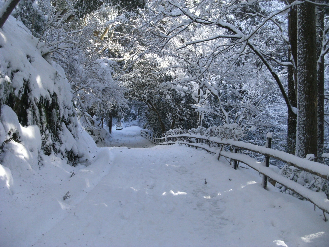 仁王門から由岐神社まで、道はおおむねまっすぐですが、神社を過ぎたところから本殿の少し手前まで、うねうねと曲がった坂道になりります。大した標高差ではないので、九十九折という表現は、いささか大げさ過ぎる印象。まっすぐ登ればあっという間なのでしょうが、ゆるやかな坂道は、時間はかかっても歩きやすいので、自分のような膝痛もちには助かります。雪景色の道はとてもきれいでしたし、雪が積もっていても、すべって歩きにくくなるほどの傾斜ではありません。