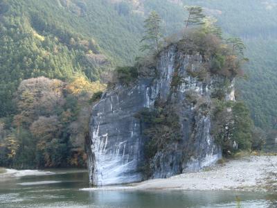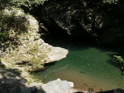 面河渓に行く途中、立ち寄りました。御三戸バス停には面河行きの伊予鉄バスと、JR四国バスの松山高知急行線の両方止まるので、バスの時間差を利用して見物。道路からも見えますが、川原に下りて近くで見ると、より迫力があります。