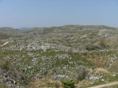 秋芳洞の黒谷口から遊歩道があり、軽いハイキングのような感じで楽しめます。はじめは雑木林の山道ですが、そのうち木がなくなって草原と白っぽい岩が広がるカルスト台地に出ます。独特の景観でおもしろいです。カルスト台地の中にもあちこちコースがめぐらされていて、歩きがいがあります。