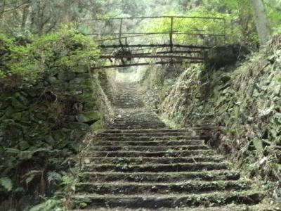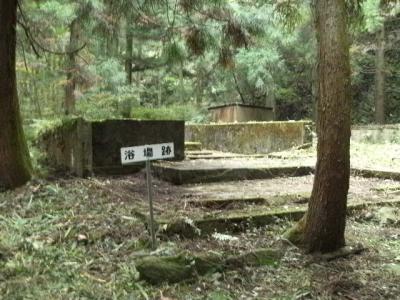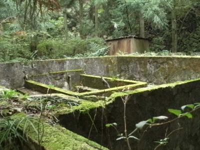 マイントピア別子の駐車場の隅っこから山に階段で登る道がついており、そこが入口になります。観光地化された東平ゾーンや端出場ゾーンと違って、ここは半ば自然に還りつつある感じですが、草刈や標識の設置などある程度の整備はされているので、とくに危険や通過困難なところはありません。かつては300戸、1300人が暮らしていたということで、山の上のほうまで延々と石垣が続いており、規模の大きさを実感します。コンクリートの浴場や区画をつなぐ鉄橋の残骸もあります。