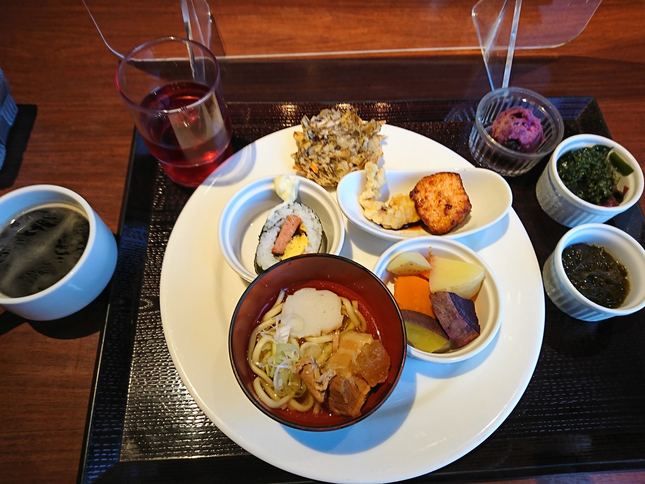 口コミで朝食が評価が高いのでこちらのホテルに決めました。県庁前駅からリウボウ交差点を対角線に渡ってすぐです。一階にファミマがあり便利です。お部屋は禁煙シングル。街中にありますが静かな環境でした。化粧水などのアメニティセットがフロントで貰えました。ジャンプー、コンディショナー、ボディソープはknollのものでした。エレベーターのアロマの香りがキツイのが気になりました。