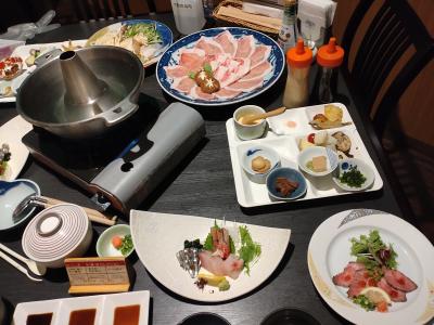 部屋は、山側と海側とあるようです。海側、和洋室にしました。広々した部屋からは 大隅半島がい地方出来て絶景でした。食事は、黒豚しゃぶしゃぶ+ハーフバイキングでしたが、食べきれないほどの品数でおいしくいただきました。