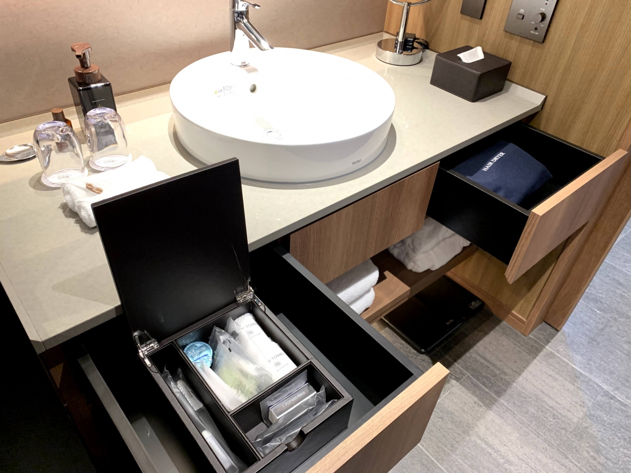 - 新しく客室でスーツケースも余裕で広げることができますが全体の色合いのせいか見た目は少し狭く感じます